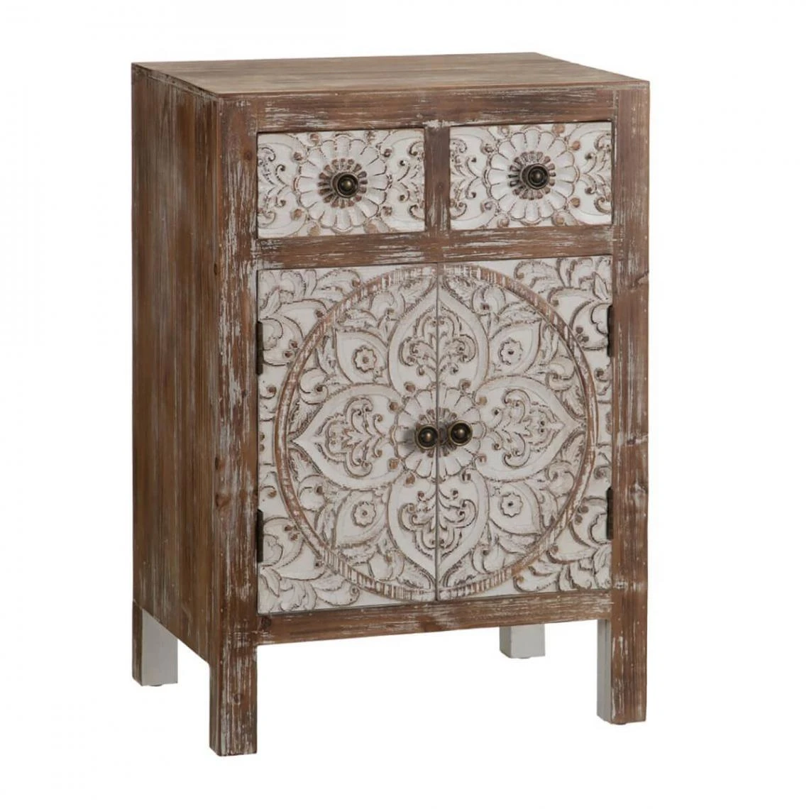 Table d’Appoint 2 Portes 2 Tiroirs Bois Naturel et Blanc de la gamme Lorea.
