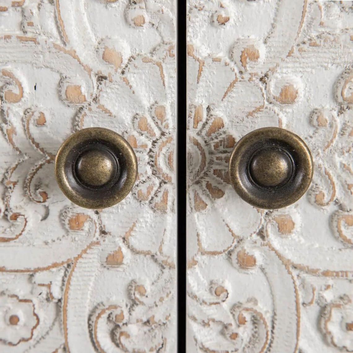 Structure en pin massif et en MDF. Façade porte et tiroir laqué blanc. Motif floral en relief.