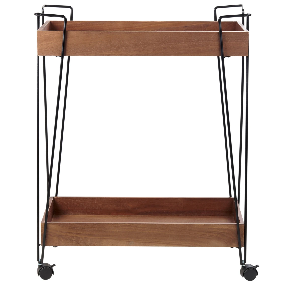 Desserte de cuisine à roulettes. Assurez-vous de ne jamais manquer d’espace pour vos aliments avec ce chariot de cuisine. Fabriquée en bois de paulowania durable et en métal, cette pièce est durable même sans entretien quotidien. La pièce comporte 2 niveaux avec des étagères de grande capacité, afin que vous puissiez placer des couverts, des assiettes et plus encore. Il est également très stable et facile à déplacer grâce à ses roulettes verrouillables. Détails: Type de produit: Chariot de cuisine Style: Rustique Couleur principale: Bois foncé Type de matière: Bois solide Matière principale: Métal Matière secondaire: Bois de paulownia Matière du piétement: Métal Matière du plateau: Bois solide Tiroirs: Non Finition: Revêtu de poudre Patins pour pieds: Non Étagères: Oui Dimensions: Profondeur: 30 cm Largeur: 60 cm Hauteur: 78 cm Poids: 4 kg Charge maximum de l`étagère:: 4 kg Charge admise du plateau: 4 kg L`offre inclue: 1 x Desserte de cuisine Caractéristiques clés: Vérrou pratique, Décoratif et fonctionnel, Matières robustes faciles à entretenir, Construction durable et stable, Multifonctionnel Informations d`assemblage: À assembler entièrement. 20 – 40 min Informations supplémentaires: Le bois est un produit naturel. Toutes différences de couleur ou de texture, telles que les taches, plis ou autres marques, sont des phénomènes naturels et ne peuvent pas être considérés comme défauts. Conseils de maintenance: Bois solide: 1.Nettoyez avec un chiffon et un nettoyant doux dans le sens du grain du bois 2.De temps en temps, il est conseillé de mettre une nouvelle couche d’huile sur les meubles avec une finition huilée 3.Essuyez immédiatement après le nettoyage pour empêcher l’eau de s’accumuler sur les meubles. Métal: 1. Nettoyez avec un chiffon et un détergent doux, essuyez bien ensuite 2.Pour les éléments en cuivre ou chromés, utilisez un produit de polissage spécial 3.Pour éviter les rayures, n’utilisez pas de nettoyants abrasifs.
