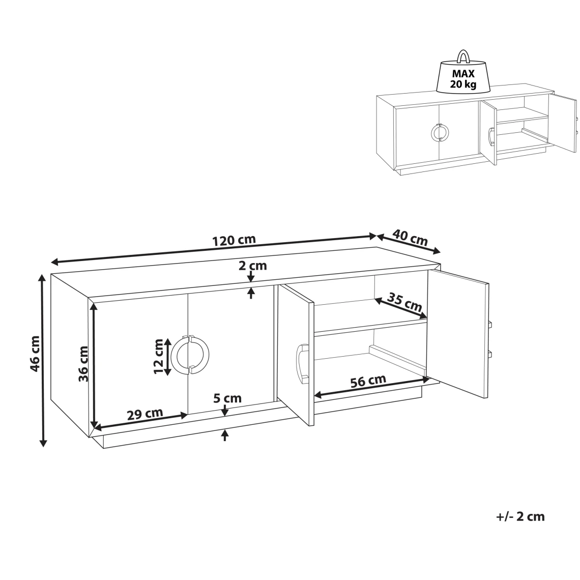 Buffet élégant. Si vous êtes à la recherche d’un meuble qui donne du style à votre intérieur, ce buffet polyvalent est un excellent choix. Sa forme simple, construite en MDF durable dans une finition noire, est enrichie de poignées métalliques rondes dans une teinte dorée pour une touche glamour. Le buffet fonctionne parfaitement comme point focal dans votre couloir, et grâce aux étagères intérieures, il constitue la solution de rangement parfaite pour tout salon ou chambre à coucher. Détails: Type de produit: Buffet Style: Moderne Couleur principale: Noir Type de matière: Bois d’ingénierie Matière principale: MDF Matière secondaire: Métal Matière du piétement: Bois d’ingénierie Nombre d`étagères: 4 Tiroirs: Non Finition: Peint Verrouillable à clé: Non Nombre de portes: 4 Étagères: Oui Dimensions: Profondeur: 40 cm Largeur: 120 cm Hauteur: 46 cm Poids: 29 kg Charge admise du plateau: 20 kg L`offre inclue: 1 x Meuble de rangement Caractéristiques clés: Solution parfaite pour la chambre et le salon, Design moderne, Matières de haute qualité, Facile à entretenir, Espace de rangement fonctionnel, Tampon pour éviter de rayer la surface Informations d`assemblage: À assembler entièrement. plus de 60 min Conseils de maintenance: MDF: 1.Nettoyez avec un chiffon et un détergent doux. Essuyez bien après le nettoyage.