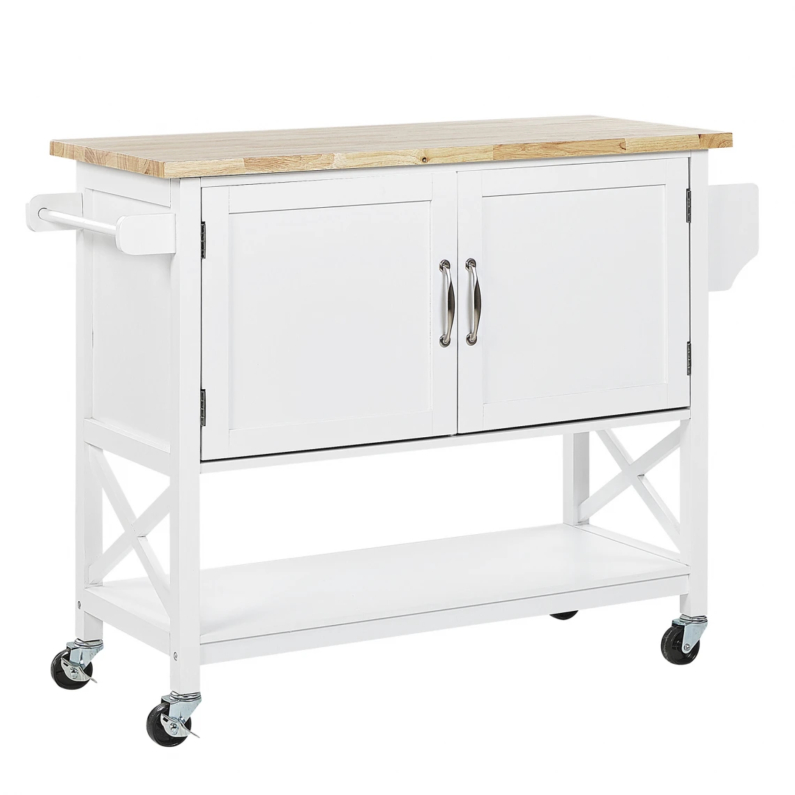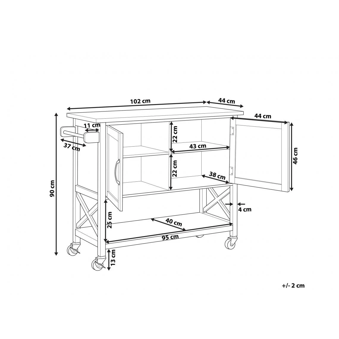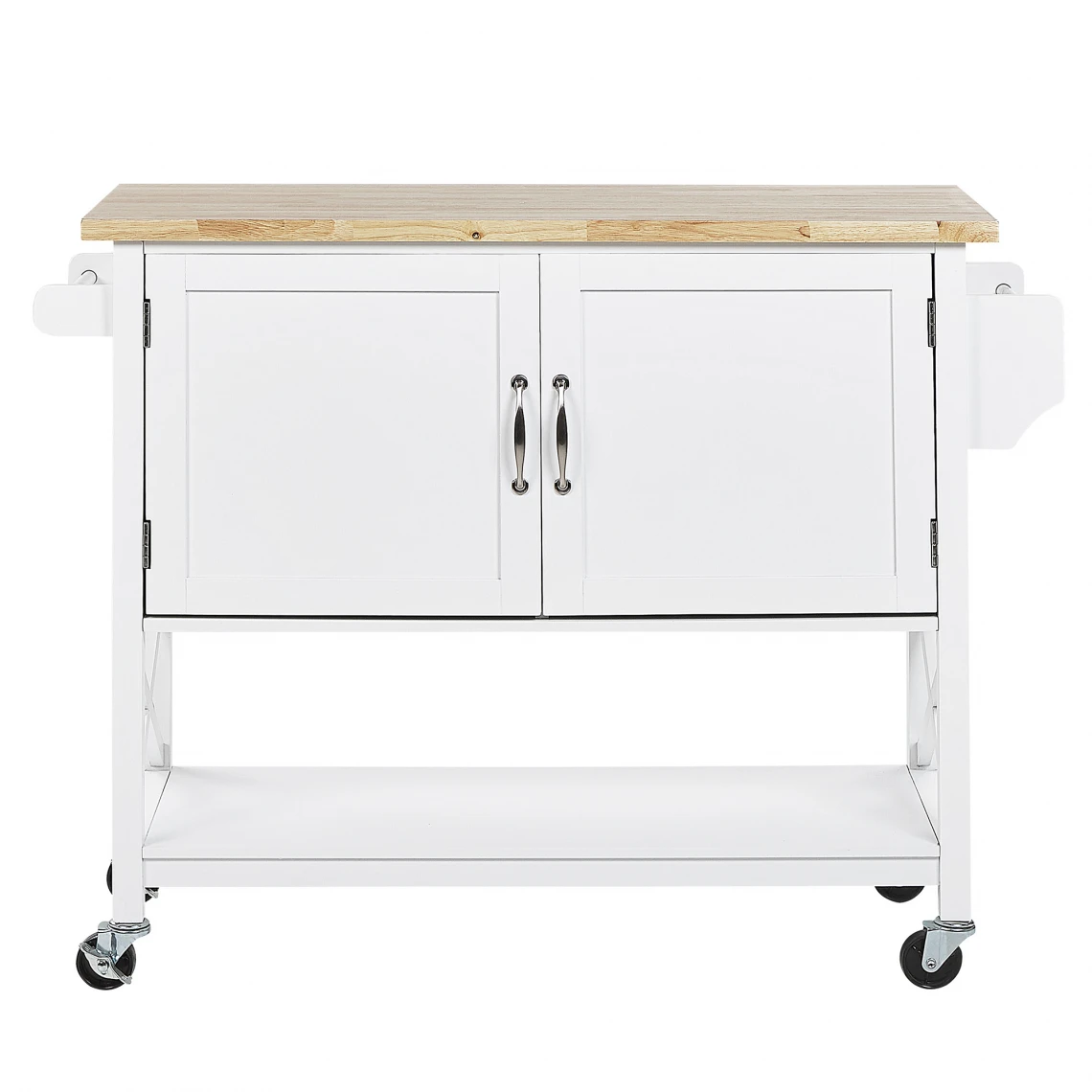 Desserte de cuisine à roulettes blanche avec plateau en bois et 2 portes. Cette desserte de cuisine est un classique scandinave qui s’intègre magnifiquement dans pratiquement tous les intérieurs modernes ou rustiques. Elle dispose d’un plateau en bois massif clair et d’un corps en MDF durable pour une longévité accrue. Un mariage de couleurs qui ajoutera une touche naturelle à votre cuisine ou salon. Cette desserte, facilement déplaçable grâce aux roulettes pratiques, vous offre aussi beaucoup d’espace de rangement : 4 compartiments intérieurs fermés avec 2 portes décoratives et une étagère spacieuse ! Vous pouvez utiliser ce chariot pour servir vos plats, comme petit îlot de cuisine ou encore comme un meuble de rangement pour votre salle de bains. Vous allez l’adorer ! Détails: Type de produit: Chariot de cuisine Style: Moderne Couleur principale: Blanc Type de matière: Bois d’ingénierie Matière principale: MDF Matière secondaire: Bois d’hévéa Matière du piétement: Bois solide Matière du plateau: Bois solide Tiroirs: Non Finition: Mat Patins pour pieds: Non Nombre de portes: 2 Étagères: Oui Dimensions: Profondeur: 44 cm Largeur: 102 cm Hauteur: 90 cm Poids: 33 kg Charge maximum de l`étagère:: 5 kg Charge admise du plateau: 20 kg L`offre inclue: 1 x Desserte de cuisine Caractéristiques clés: Porte-serviettes dédié, Étagère ouverte, facilement accessible, Convient dans une salle à manger, une cuisine ou un bar, Facilement transportable grâce à ses roulettes pivotantes, Rangement spacieux Informations d`assemblage: À assembler entièrement. 45 – 60 min Conseils de maintenance: MDF: 1.Nettoyez avec un chiffon et un détergent doux. Essuyez bien après le nettoyage. Bois d’hévéa: 1.Essuyez immédiatement après le nettoyage pour empêcher l’eau de s’accumuler sur les meubles 2.Nettoyez avec un chiffon et un nettoyant doux dans le sens du grain du bois 3.De temps en temps, il est conseillé de mettre une nouvelle couche d’huile sur les meubles avec une finition huilée.