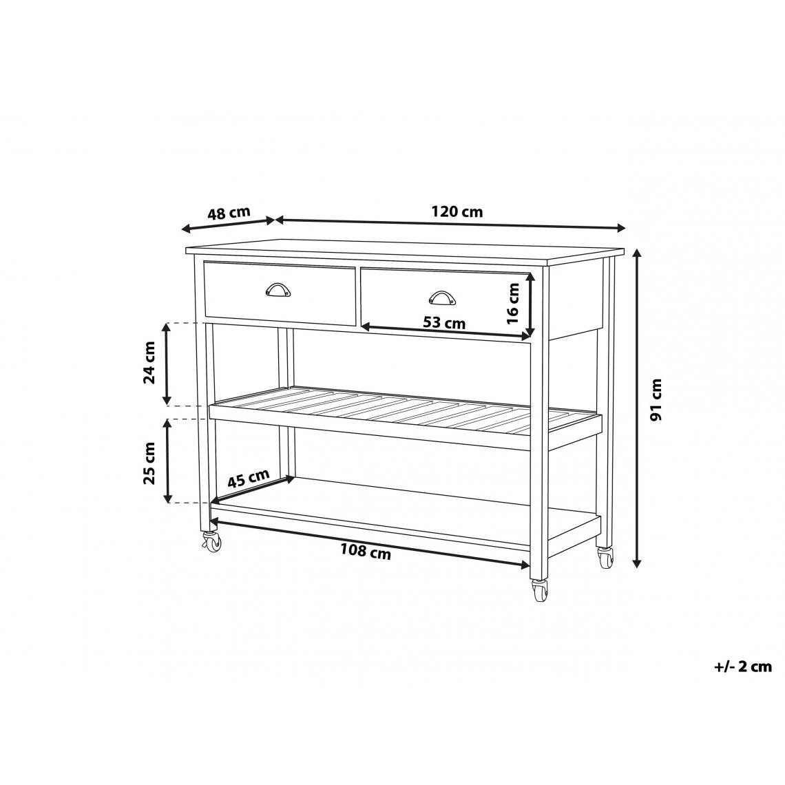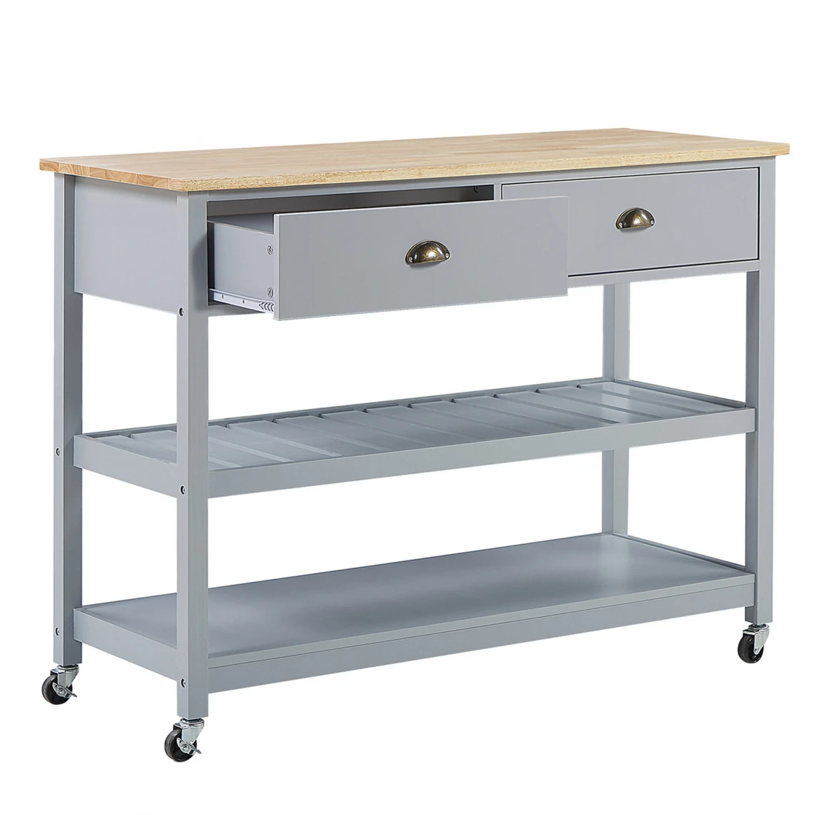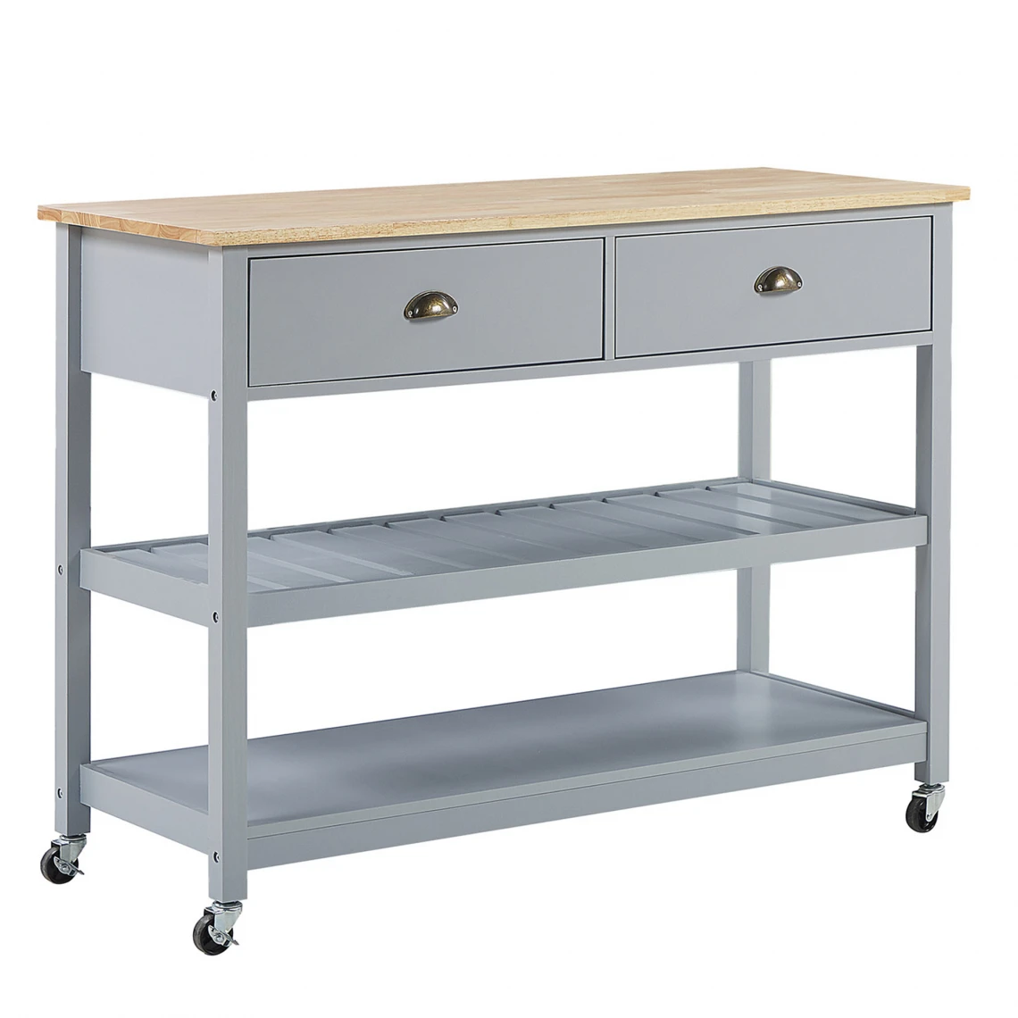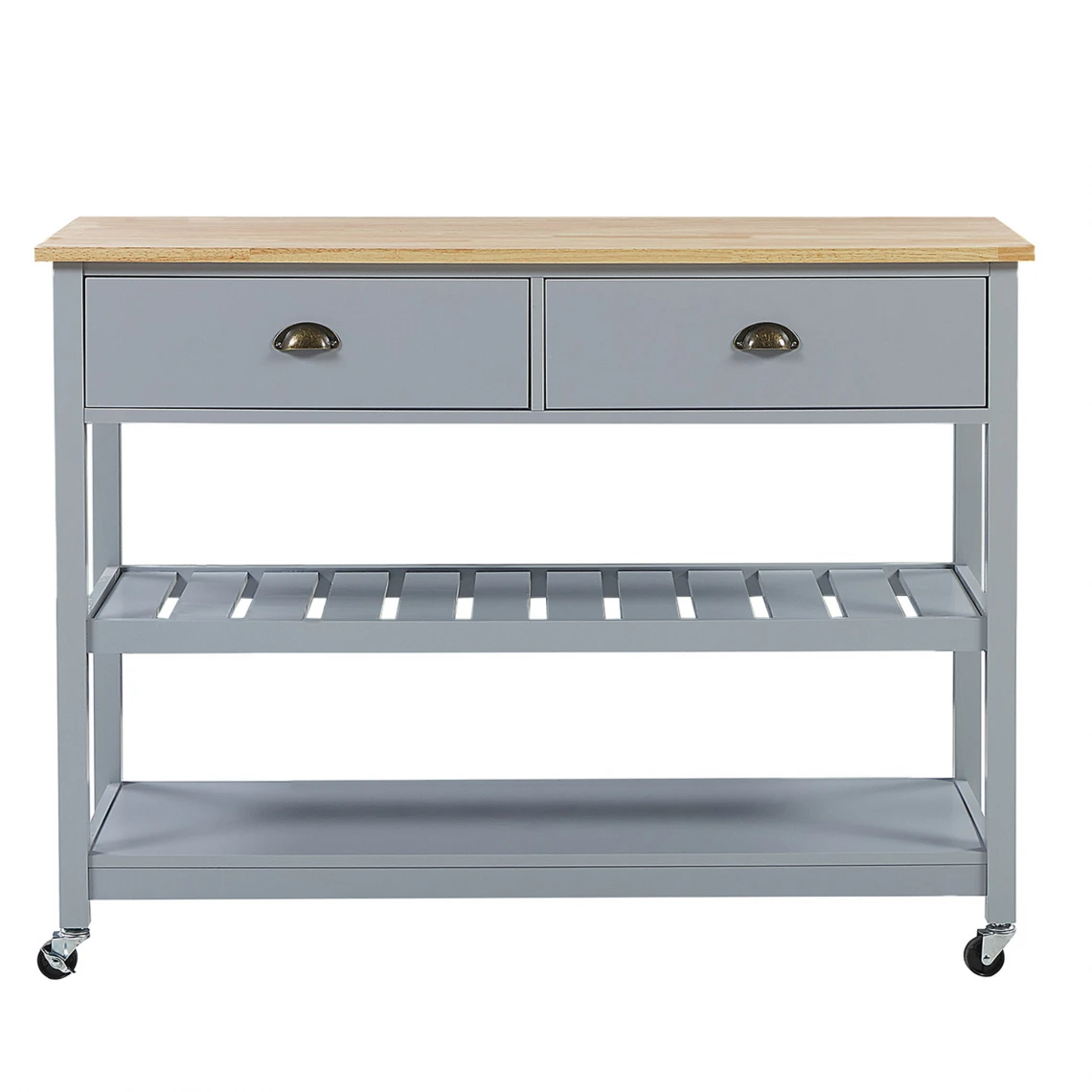 Desserte grise à roulettes avec plateau bois clair. Cette desserte de cuisine sera la meilleure solution si vous recherchez un plan de travail supplémentaire pour votre coin repas. Le design simple avec sa structure en MDF et le plateau en bois d’hévéa en font un accessoire parfait pour chaque l’intérieur moderne, traditionnel et maison de campagne. Cette jolie desserte est dotée de deux étagères et de deux tiroirs spacieux. Les 4 roulettes pivotent à 360°, ce qui permet de déplacer le chariot facilement. Détails: Type de produit: Chariot de cuisine Style: Traditionnel Couleur principale: Gris Type de matière: Bois solide Matière principale: MDF Matière secondaire: Bois de pin Matière du piétement: Bois solide Matière du plateau: Bois solide Tiroirs: Oui Finition: Brillant Patins pour pieds: Non Étagères: Oui Dimensions: Profondeur: 48 cm Largeur: 120 cm Hauteur: 91 cm Poids: 34 kg Charge maximum du tiroir: 10 kg Charge maximum de l`étagère:: 20 kg Charge admise du plateau: 20 kg L`offre inclue: 1 x Desserte de cuisine Caractéristiques clés: Facilement transportable grâce à ses roulettes pivotantes, Tiroirs pratiques et spacieux, Convient dans une salle à manger, une cuisine ou un bar, Grand espace de stockage, Multifonctionnel Informations d`assemblage: À assembler entièrement. 45 – 60 min Conseils de maintenance: MDF: 1.Nettoyez avec un chiffon et un détergent doux. Essuyez bien après le nettoyage. Bois de pin: 1.Nettoyez avec un chiffon et un nettoyant doux dans le sens du grain du bois 2.De temps en temps, il est conseillé de mettre une nouvelle couche d’huile sur les meubles avec une finition huilée 3.Essuyez immédiatement après le nettoyage pour empêcher l’eau de s’accumuler sur les meubles.