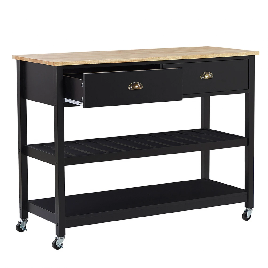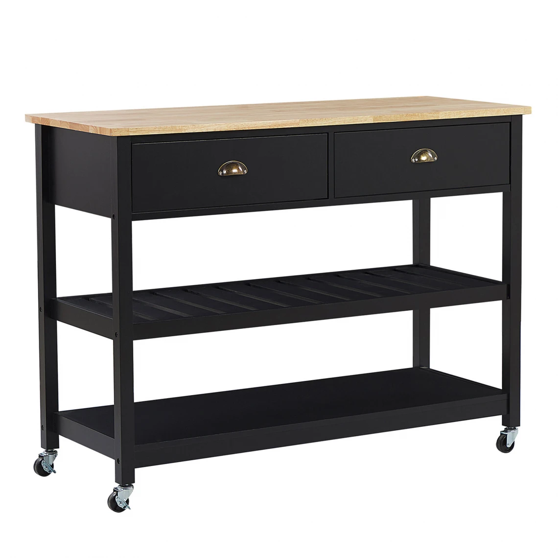 Desserte noire à roulettes avec plateau en bois clair. Cette desserte de cuisine sera la meilleure solution si vous recherchez un plan de travail supplémentaire pour votre coin repas. Le design simple avec sa structure en MDF et le plateau en bois d’hévéa en font un accessoire parfait pour chaque l’intérieur moderne, traditionnel et maison de campagne. Cette jolie desserte est dotée de deux étagères et de deux tiroirs spacieux. Les 4 roulettes pivotent à 360°, ce qui permet de déplacer le chariot facilement. Détails: Type de produit: Chariot de cuisine Style: Traditionnel Couleur principale: Noir Type de matière: Bois solide Matière principale: MDF Matière secondaire: Bois de pin Matière du piétement: Bois solide Matière du plateau: Bois solide Tiroirs: Oui Finition: Brillant Patins pour pieds: Non Étagères: Oui Dimensions: Profondeur: 48 cm Largeur: 120 cm Hauteur: 91 cm Poids: 34 kg Charge maximum du tiroir: 10 kg Charge maximum de l`étagère:: 20 kg Charge admise du plateau: 20 kg L`offre inclue: 1 x Desserte de cuisine Caractéristiques clés: Facilement transportable grâce à ses roulettes pivotantes, Tiroirs pratiques et spacieux, Convient dans une salle à manger, une cuisine ou un bar, Grand espace de stockage, Multifonctionnel Informations d`assemblage: À assembler entièrement. 45 – 60 min Conseils de maintenance: MDF: 1.Nettoyez avec un chiffon et un détergent doux. Essuyez bien après le nettoyage. Bois de pin: 1.De temps en temps, il est conseillé de mettre une nouvelle couche d’huile sur les meubles avec une finition huilée 2.Essuyez immédiatement après le nettoyage pour empêcher l’eau de s’accumuler sur les meubles 3.Nettoyez avec un chiffon et un nettoyant doux dans le sens du grain du bois.