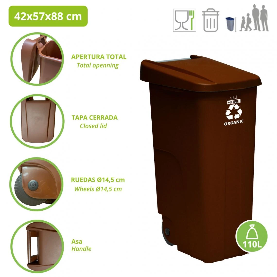 Points forts WellHome Conteneur Wellhome recycler 110 litres, fermé avec couvercle, idéal pour le recyclage des déchets organiques, avec roues + sacs à ordures 3x 10 unités