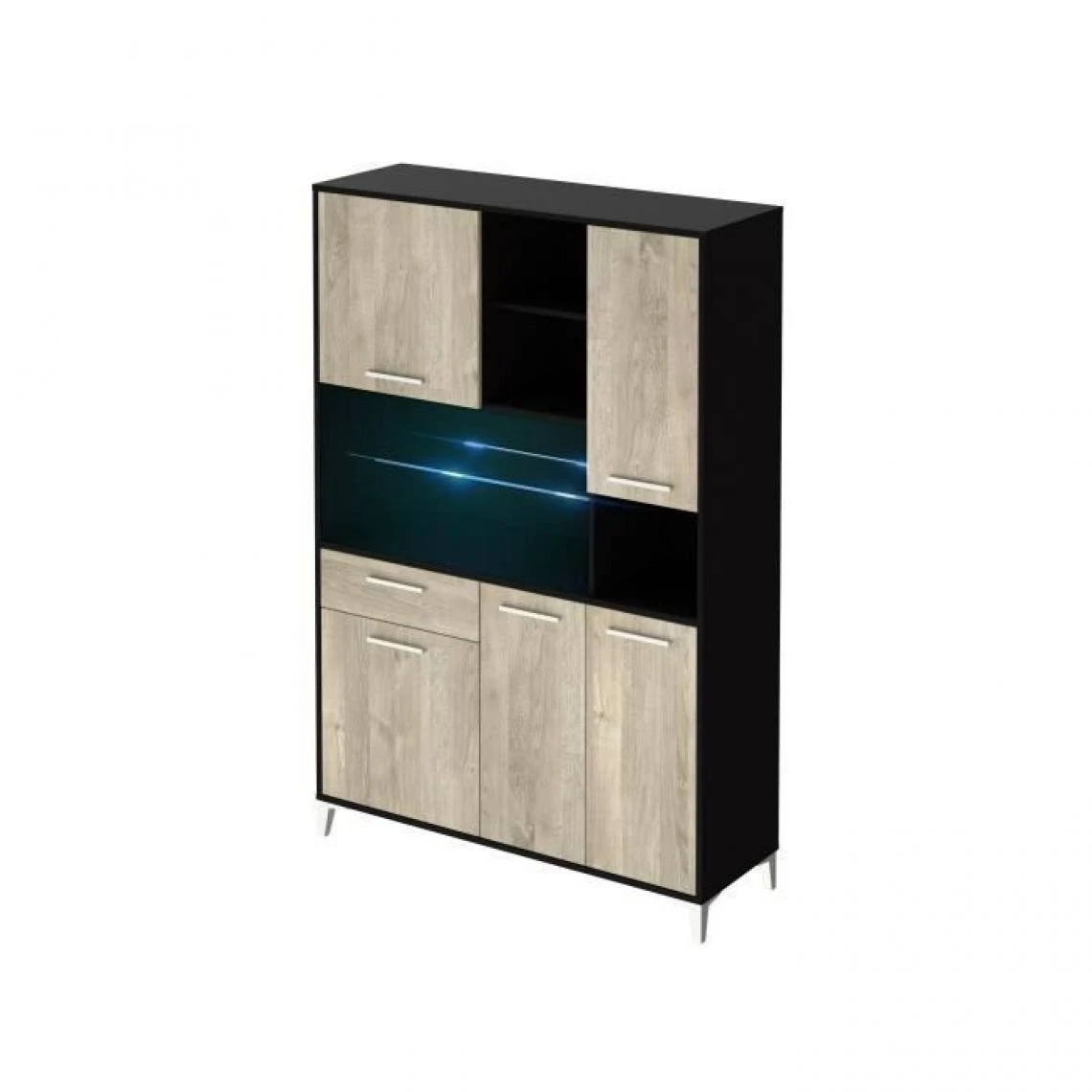 ECO Buffet de cuisine avec LED – Structure en panneaux de particules décor chene pour les façades et mélaminé noir mat pour les structures – Style et design contemporain – 5 portes, 1 tiroir et 1 étagere – Fabrication européenne – Dimensions totales L 120 x P 40 x H 178 cm.