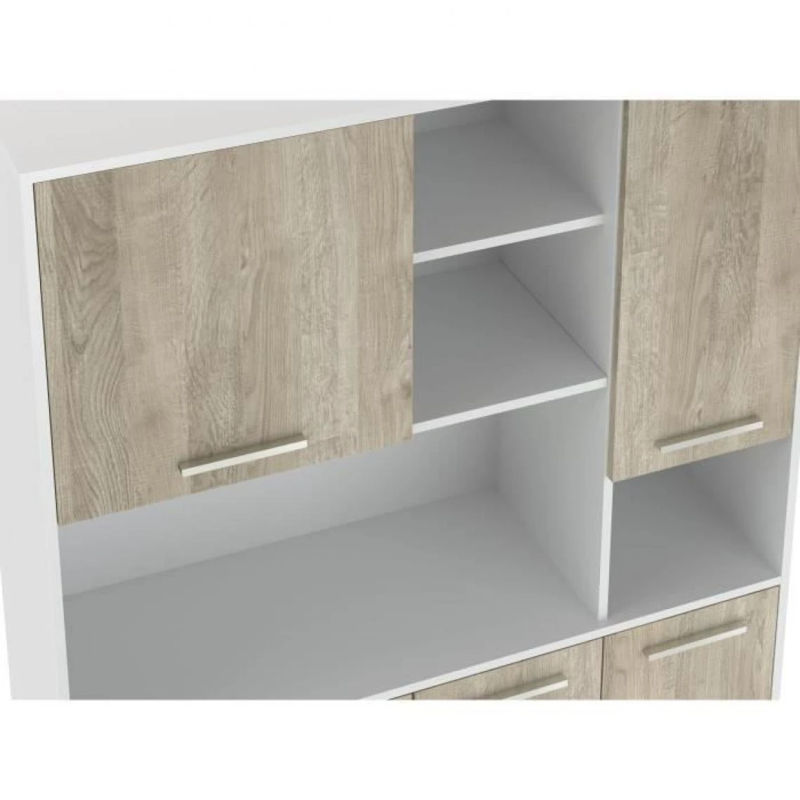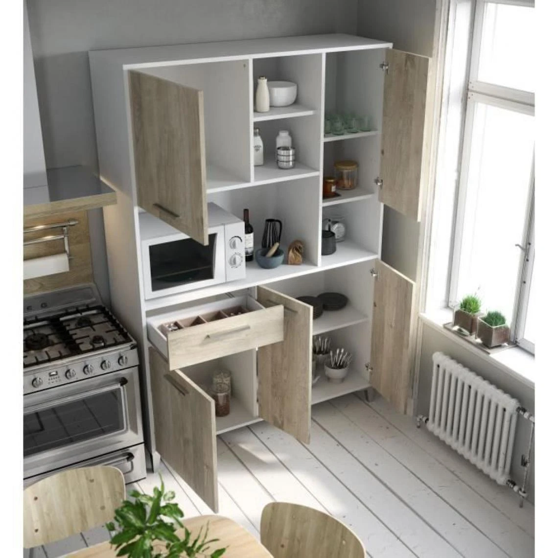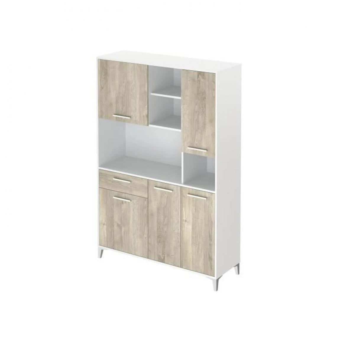 buffet de cuisine – structure en panneaux de particules décor chêne pour les façades et mélaminé blanc mat pour les structures – style et design contemporain – 5 portes, 1 tiroir et 1 étagère – fabrication européenne – dimensions totales l 120xp 40xh 178 cm.