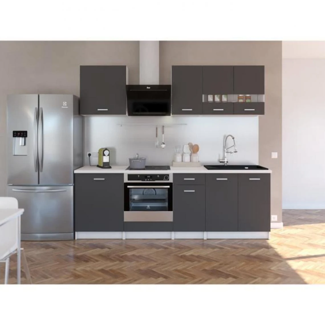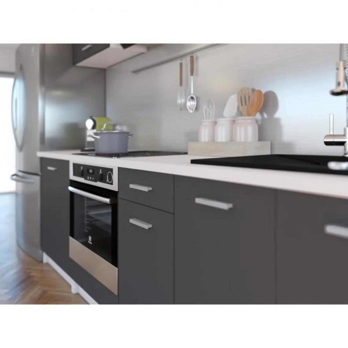 240 – cuisine complète 240 cm coloris gris mat – profondeur 60 cm – ensemble de 7 meubles – 3 meubles haut – 4 meubles bas – structure de caissons blanc mat – façades de couleur finition mat – poignée design.