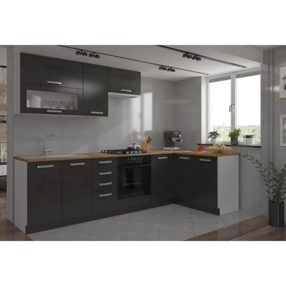 La cuisine LASSEN d’angle de 240 de largeur et 165 cm de profondeur en coloris beton fonce avec meuble four et meuble hotte est fabriquée a partir de matériaux résistants et d’excellente qualité. Les caissons et les facades sont réalisés en panneaux de particules (16mm) et recouverts de mélaminé. Les chants sont en pvc 2 mm. Le plan de travail inclus de profondeur 60 cm est réalisé en panneaux de particules (épaisseur 28mm), stratifié i, chants mélaminés .