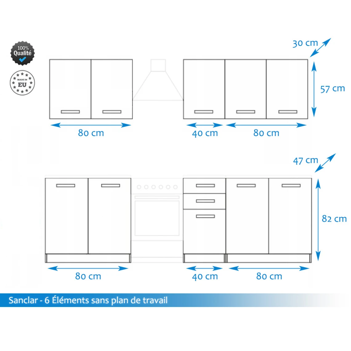 Hauteur des éléments bas : 82cm hors plan de travail. Éléments hauts : 57cm