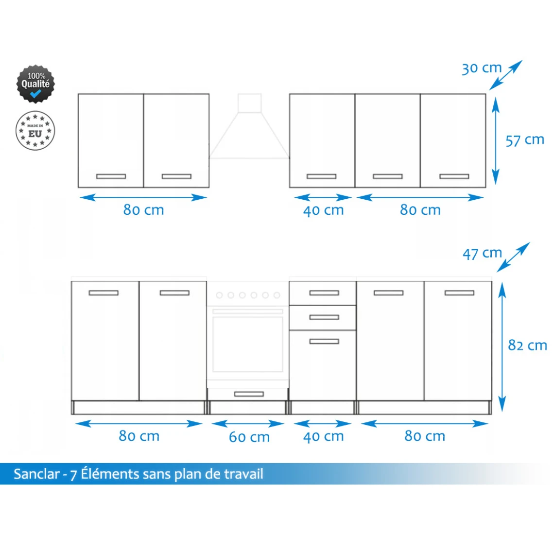 Hauteur des éléments bas : 82cm hors plan de travail. Éléments hauts : 57cm