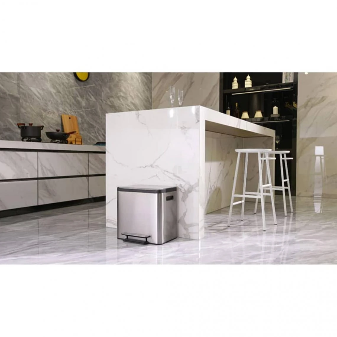 La poubelle argentée mate EcoCasa de 30 L de la marque EKO est une poubelle rectangulaire élégante en acier inoxydable brossé avec revêtement anti-empreintes digitales et poignées de couvercle en plastique. Elle est équipée d’un couvercle à fermeture en douceur et d’un seau intérieur en plastique. La fonction de maintien en position ouverte verrouille le couvercle pour faciliter le nettoyage de la poubelle ou le remplacement du sac à déchets. C’est une solution de confinement des déchets idéale pour toute cuisine moderne.