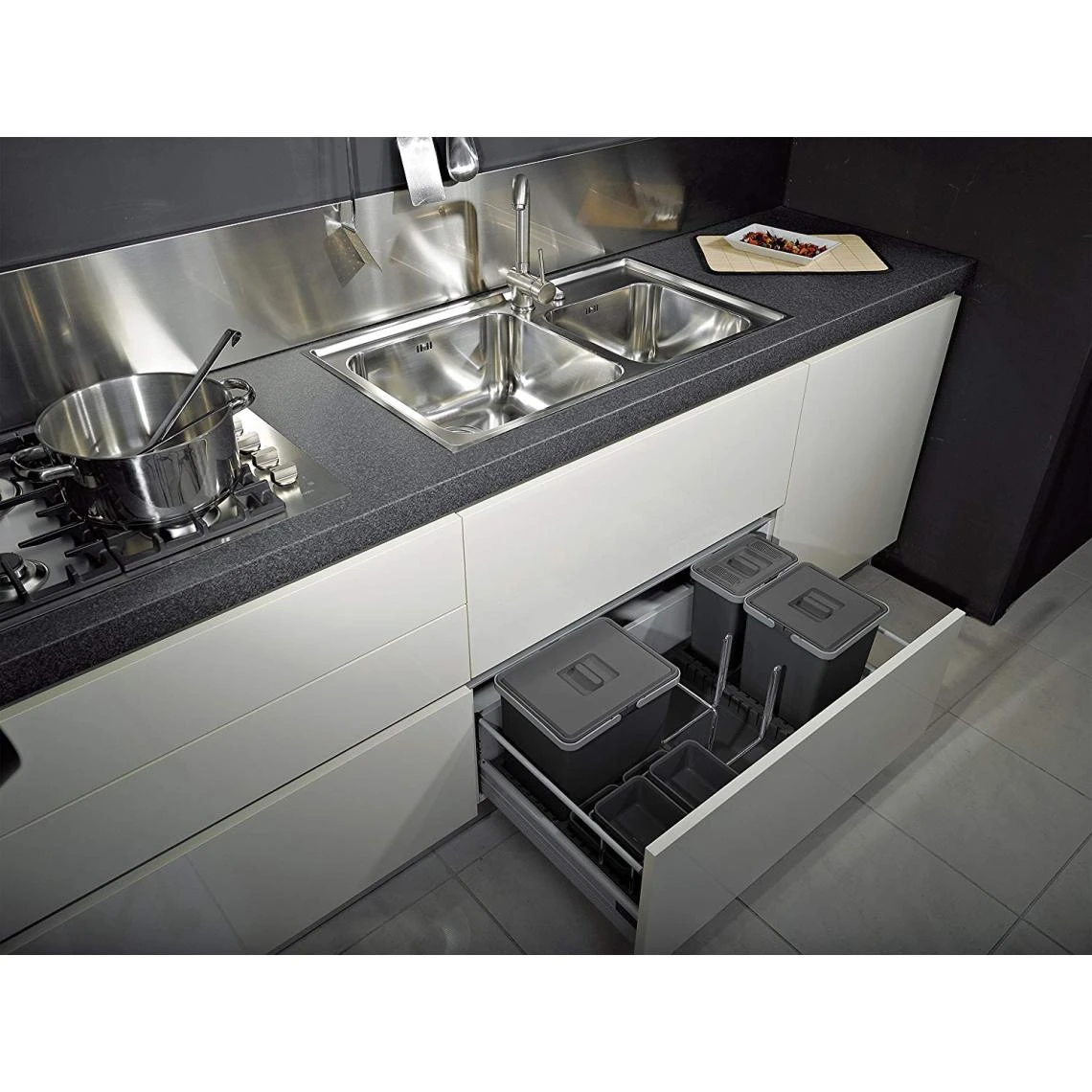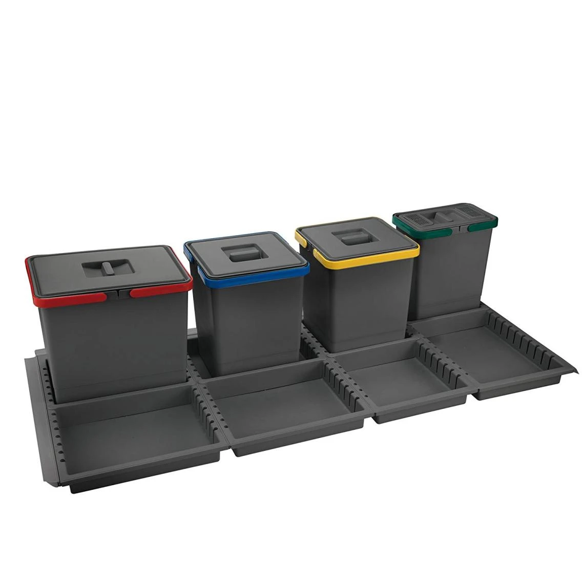 ELLETIPI – Poubelle tri sélectif d’espace de rangement dans le tiroir entièrement en plastique. La ligne de poubelles de design et praticissime. Dans leur simplicité permettent de mieux s’organiser les espaces de son bac comme on préfère. Les bacs avec les intercalaires mobiles permettent de réorganiser les récipients comme plus qu’on préfère, et les espaces libres peuvent être utilisés pour stocker savon, sacs, éponges et autres. À l’intérieur vous trouverez les récipients pour un filtrage globale de 15 x 10 x 10 x 6 litres. Un bol est toujours doté d’un couvercle avec filtre qui dévore les odeurs (Lavage jusqu’à 50 fois). Fait pour être inséré à l’intérieur de vos bases de cuisine avec coffre, cet article est équipé de joints flexibles extérieures qui permettent de préserver le bac de tout résidu de saleté qui peut “sortir des récipients et permet de autoadattarsi à vos mesures intérieures du tiroir. Simple Installation et montage rapide grâce aux accroches à pression?; ensuite seulement en appui dans le bac. Formulaire pour cassette de dimension extérieure 120 cm. Poubelle différenciée pour tiroir