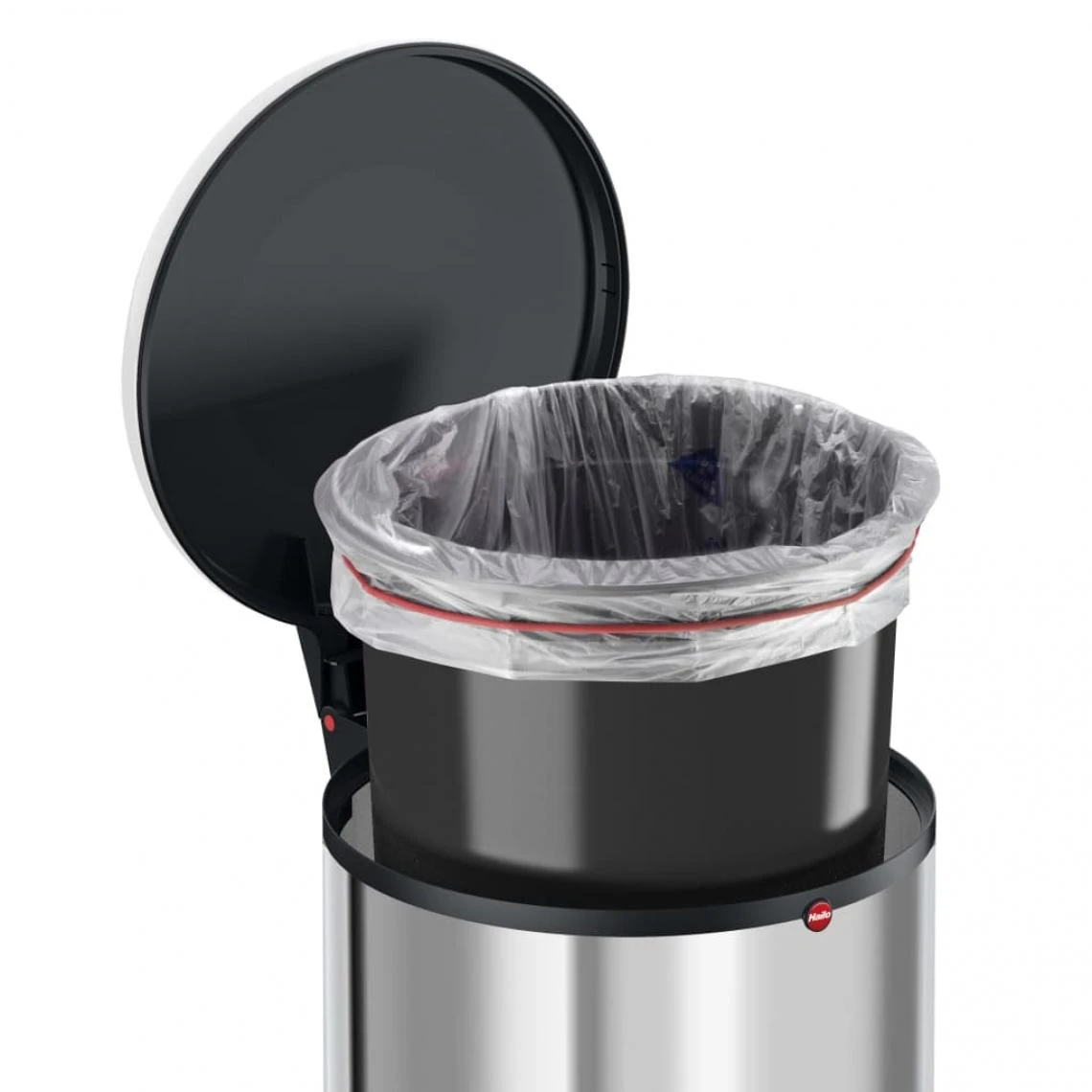 Cette poubelle à pédale Harmony de la marque Hailo est facile à utiliser et est parfaite pour la maison et le bureau. La poubelle, équipée de mécanisme de fermeture en douceur et d’un rail de pied ergonomique, permet une utilisation facile au pied afin que les deux mains soient disponibles pour contenir les déchets et que la poubelle ne se salisse pas. Le grand angle d’ouverture garantit que les déchets tombent facilement dans la poubelle. La base large avec 2 pieds antidérapants permet une stabilité accrue. Le bac intérieur amovible peut être retiré facilement grâce à sa poignée de transport. De plus, il y a un anneau de serrage en caoutchouc rouge pour que les sacs poubelle restent parfaitement en place.