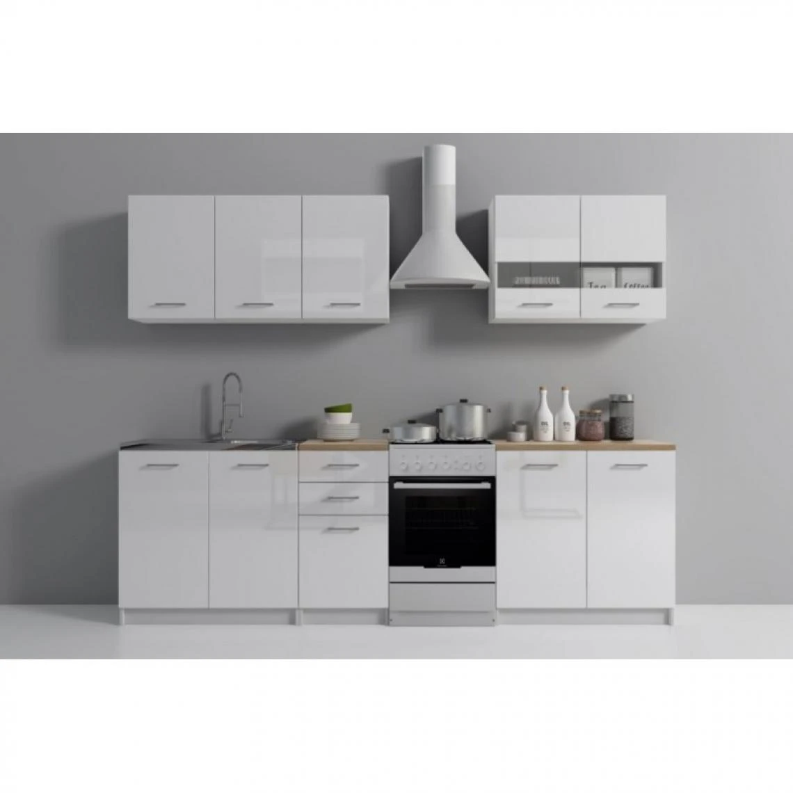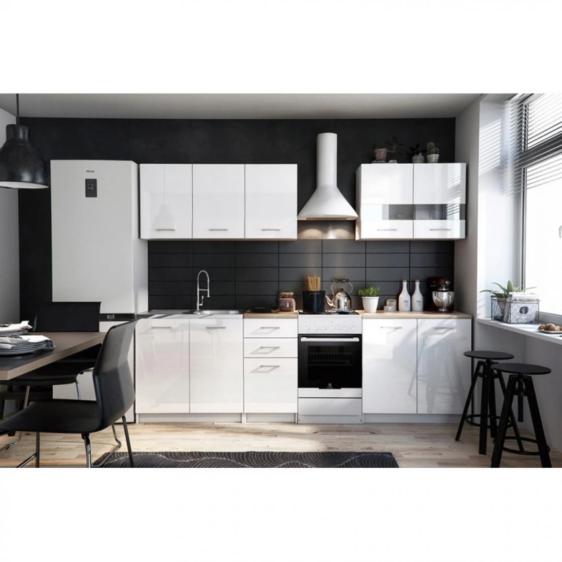 Ensemble de meubles de cuisine ANINE combine une excellente qualité de fabrication et une esthétique sobre qui s’adaptera à tous les intérieurs. Ensemble composé des éléments suivants : plan de travail prédécoupé (le morceau pour le meuble sous-évier non fourni), meuble sous évier de 80cm, meuble bas L 40 cm, meuble bas L 80, deux meubles hauts L 80 cm, meuble haut L 40 cm, POINTS FORTS: Set de meubles de cuisine modernes et de haute qualité, 6 armoires, Modulaire + Linéaire, idéale pour les cuisines ouvertes, Façades en blanc brillant, Plan de travail inclus – livré en plusieurs morceaux (le morceau pour le meuble sous-évier non fourni), Épaisseur du plan de travail: 3,2 cm, CARACTÉRISTIQUES TECHNIQUES: Longueur totale meubles bas: 200 cm, Longueur meubles hauts: 200 cm, Profondeur meubles bas: 45 cm; Profondeur avec le plan de travail + le vide sanitaire: 60 cm, Hauteur meubles bas (avec le plan de travail): 86 cm, Vendu sans hotte, sans four, sans évier, Livré avec pièces de montage, Meuble en kit à monter soi-même à l’aide de la notice fournie, Photos des articles le plus fidèle possible, mais restant non contractuelles, les nuances de couleur et le rendu des matières présentés à l’écran pouvant être différents de la réalité