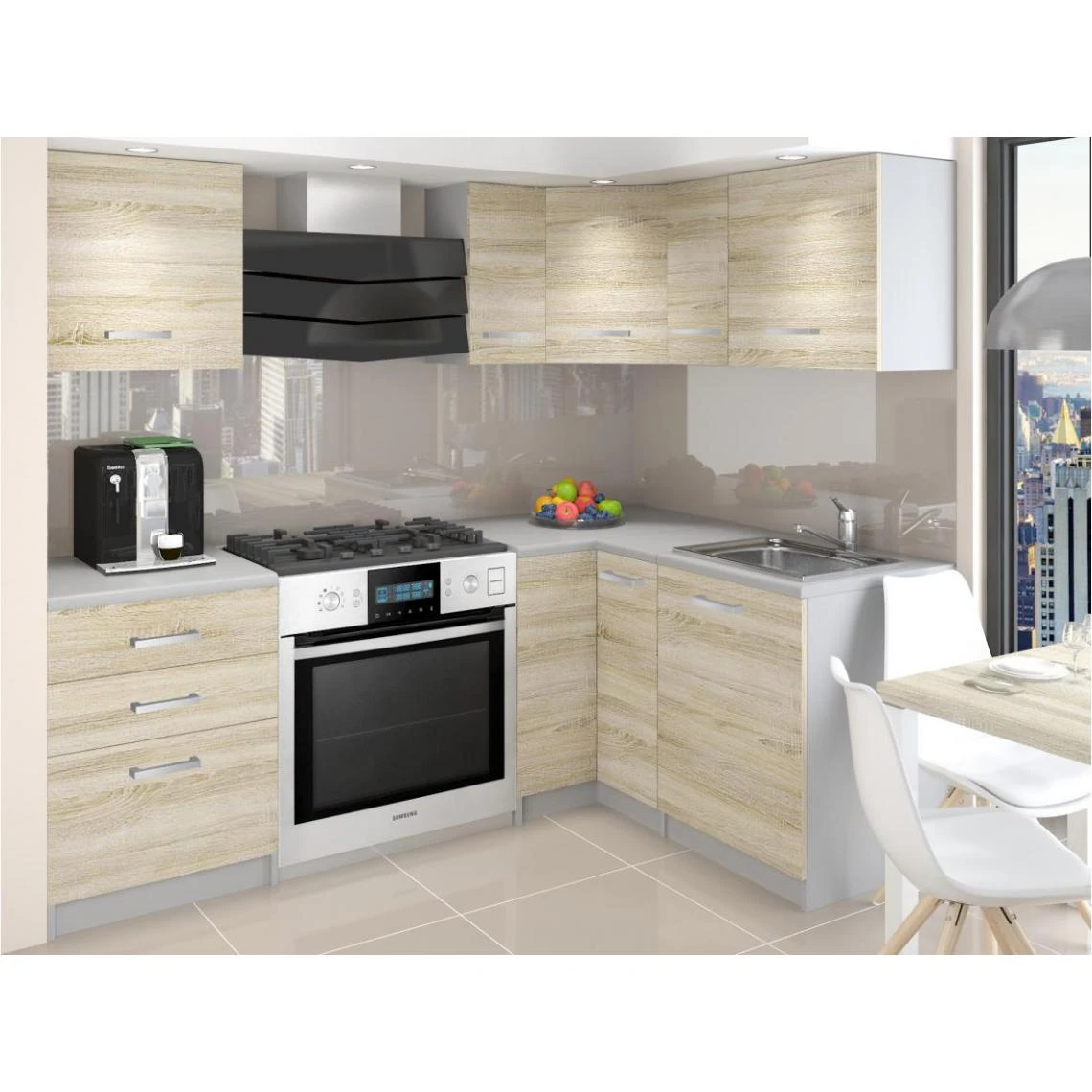 Cet ensemble de meubles de cuisine combine une qualité de fabrication et une esthétique sobre qui s’adaptera à tous les intérieurs.Cuisine livrée sans électroménager, composée de 8 éléments : meuble bas sous évier L 60 cm, meuble bas L 60 cm, meuble bas d’angle L 60 cm, deux meubles hauts L 60 cm, deux meubles hauts L 30 cm, meuble haut d’angle L 42.6 cm.Plan de travail inclus, livré en plusieurs morceaux (le morceau pour le meuble sous-évier non fourni), CARACTÉRISTIQUES TECHNIQUES: Set de meubles de cuisine modulaires offrant un bel espace de rangement tout en prenant un minimum de place, Plan de travail inclus – livré en plusieurs morceaux (le morceau pour le meuble sous-évier non fourni), Nombre d’éléments: 8, Façade: aspect bois Sonoma, Corps: gris, Poignées + Plinthes assorties inclus, Largeur meubles bas: 180 cm, Largeur meubles hauts: 222.6 cm, Profondeur plan de travail : 60 cm, Profondeur meubles bas: 45 cm + 15 cm de vide sanitaire, Meuble en kit à monter soi-même à l’aide de la notice fournie, Vendu sans hotte, sans four, sans évier, sans frigo, sans petit électroménager, Mode de livraison pour ce produit: Livraison palette au pied de l’immeuble, Photos des articles le plus fidèle possible, mais restant non contractuelles, les nuances de couleur et le rendu des matières présentés à l’écran pouvant être différents de la réalité