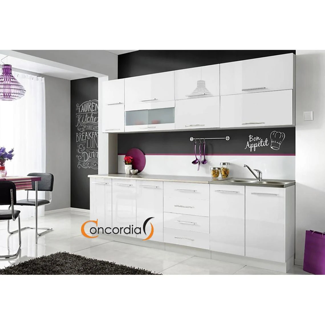 Magnifique set de cuisine complète de 2,6 m qui vous apportera une touche raffinée et contemporaine dans votre cuisine. Son style moderne et structure de haute qualité vous permettront de trouver un équilibre entre rôle utile et cuisine design. Le lot est composé de: Plan de travail livré en plusieurs morceaux (le morceau pour le meuble sous-évier non fourni),Éléments hauts : meuble de 60 cm avec deux portes, deux meubles de 80 cm avec deux portes et un meuble de 40 cm avec deux portesÉléments bas : meuble sous-évier 80cm, meuble de 60 cm avec quatre tiroirs, meuble de 40 cm avec une porte, meuble de 80 cm avec deux portes, POINTS FORTS: Meubles de cuisine de haute qualité, Plan de travail inclus (livré en plusieurs morceaux, le morceau pour le meuble sous-évier non fourni), 4 Tiroirs coulissants, Poignées décoratives , Portes vitrées – verre givré, Structure de construction solide 16 mm, CARACTÉRISTIQUES TECHNIQUES: Longueur meubles bas: 260 cm, Longueur meubles hauts: 260 cm, Meubles hauts – mécanisme de fermeture avec amortisseur, Bas sur les pieds réglables, Plinthes de recouvrement assorties, Charnières invisibles encastrées, Finition: corps du meuble en blanc mat, faces avec finition brillante/gloss, Photos des articles le plus fidèle possible, mais restant non contractuelles, les nuances de couleur et le rendu des matières présentés à l’écran pouvant être différents de la réalité