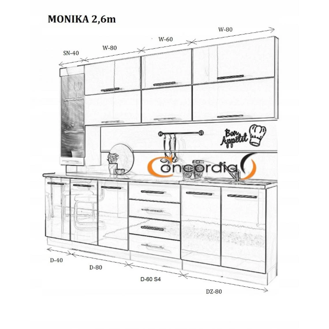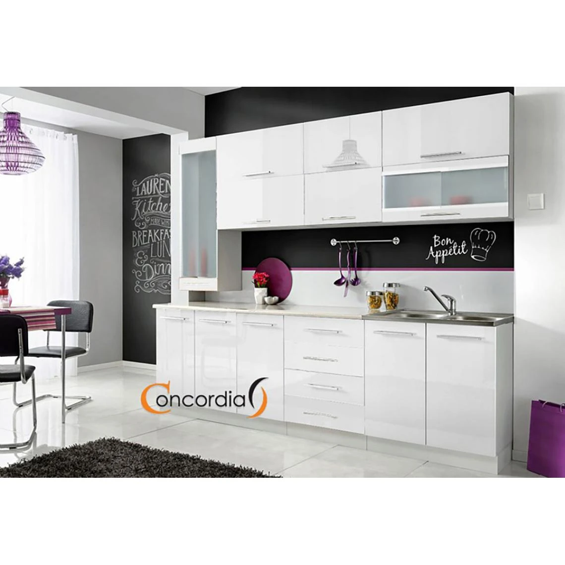 Magnifique set de cuisine complète de 2,6 m qui vous apportera une touche raffinée et contemporaine dans votre cuisine. Son style moderne et structure de haute qualité vous permettront de trouver un équilibre entre rôle utile et cuisine design. Le lot est composé de: Plan de travail livré en plusieurs morceaux (le morceau pour le meuble sous-évier non fourni),Éléments hauts : meuble de 60 cm avec deux portes, deux meubles de 80 cm avec deux portes et un meuble de 40 cm avec porte vitréeÉléments bas : meuble sous-évier 80cm, meuble de 60 cm avec quatre tiroirs, meuble de 40 cm avec une porte, meuble de 80 cm avec deux portes, POINTS FORTS: Plan de travail inclus (livré en plusieurs morceaux, le morceau pour le meuble sous-évier non fourni), 4 Tiroirs coulissants, Poignées décoratives , Façades en panneaux MDF vernis, Portes vitrées – verre givré, Structure de construction solide 16 mm, CARACTÉRISTIQUES TECHNIQUES: Longueur meubles bas: 260 cm, Longueur meubles hauts: 260 cm, Bas sur les pieds réglables, Plinthes de recouvrement assorties, Charnières invisibles encastrées à fermeture silencieuse, Support accroche pour meubles hauts réglable, Finition: corps du meuble en blanc mat, faces avec finition brillante/gloss, Photos des articles le plus fidèle possible, mais restant non contractuelles, les nuances de couleur et le rendu des matières présentés à l’écran pouvant être différents de la réalité