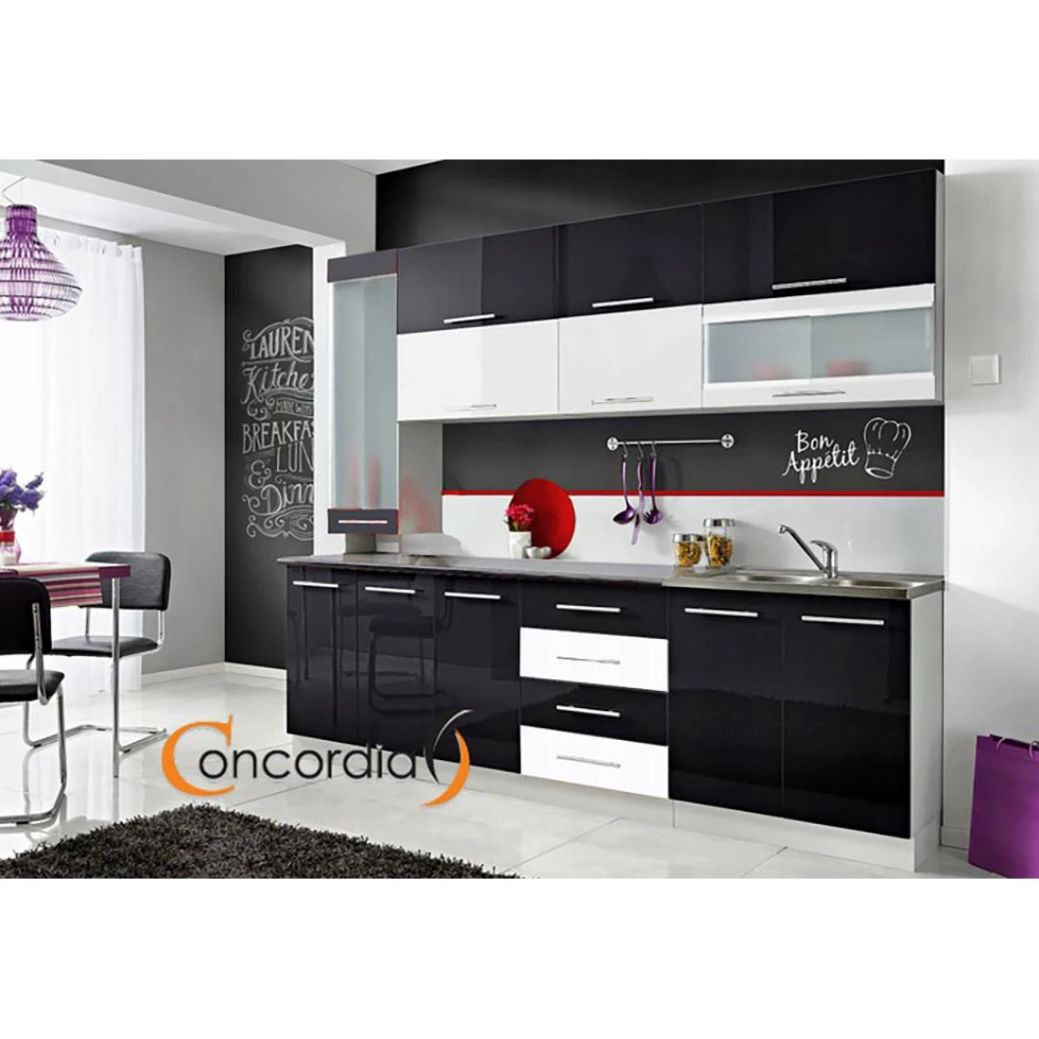 Magnifique set de cuisine complète de 2,6 m qui vous apportera une touche raffinée et contemporaine dans votre cuisine. Son style moderne et structure de haute qualité vous permettront de trouver un équilibre entre rôle utile et cuisine design. Le lot est composé de: Plan de travail livré en plusieurs morceaux (le morceau pour le meuble sous-évier non fourni),Éléments hauts : meuble de 60 cm avec deux portes, deux meubles de 80 cm avec deux portes et un meuble de 40 cm avec porte vitréeÉléments bas : meuble sous-évier 80cm, meuble de 60 cm avec quatre tiroirs, meuble de 40 cm avec une porte, meuble de 80 cm avec deux portes, POINTS FORTS: Plan de travail inclus (livré en plusieurs morceaux, le morceau pour le meuble sous-évier non fourni), 4 Tiroirs coulissants, Poignées décoratives , Façades en panneaux MDF vernis, Portes vitrées – verre givré, Structure de construction solide 16 mm, CARACTÉRISTIQUES TECHNIQUES: Longueur meubles bas: 260 cm, Longueur meubles hauts: 260 cm, Bas sur les pieds réglables, Plinthes de recouvrement assorties, Charnières invisibles encastrées à fermeture silencieuse, Support accroche pour meubles hauts réglable, Finition: corps du meuble en blanc mat, faces avec finition brillante/gloss, Photos des articles le plus fidèle possible, mais restant non contractuelles, les nuances de couleur et le rendu des matières présentés à l’écran pouvant être différents de la réalité