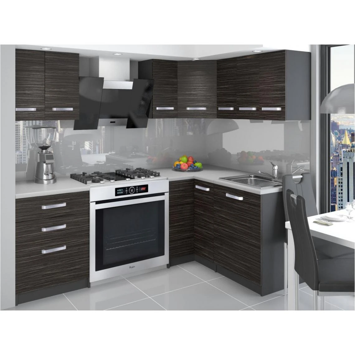 Cet ensemble de meubles de cuisine combine une qualité de fabrication et une esthétique sobre qui s’adaptera à tous les intérieurs.Cuisine livrée sans électroménager, composée de 8 éléments : meuble bas sous évier L 60 cm, meuble bas L 60 cm, meuble bas d’angle L 60 cm, deux meubles hauts L 60 cm, deux meubles hauts L 30 cm, meuble haut d’angle L 42.6 cm.Plan de travail inclus, livré en plusieurs morceaux (le morceau pour le meuble sous-évier non fourni), CARACTÉRISTIQUES TECHNIQUES: Set de meubles de cuisine modulaires offrant un bel espace de rangement tout en prenant un minimum de place, Plan de travail inclus – livré en plusieurs morceaux (le morceau pour le meuble sous-évier non fourni), Nombre d’éléments: 8, Façade: aspect bois, Corps: noir, Poignées + Plinthes assorties inclus, Largeur meubles bas: 180 cm, Largeur meubles hauts: 222.6 cm, Profondeur plan de travail : 60 cm, Profondeur meubles bas: 45 cm + 15 cm de vide sanitaire, Meuble en kit à monter soi-même à l’aide de la notice fournie, Vendu sans hotte, sans four, sans évier, sans frigo, sans petit électroménager, Mode de livraison pour ce produit: Livraison palette au pied de l’immeuble, Photos des articles le plus fidèle possible, mais restant non contractuelles, les nuances de couleur et le rendu des matières présentés à l’écran pouvant être différents de la réalité