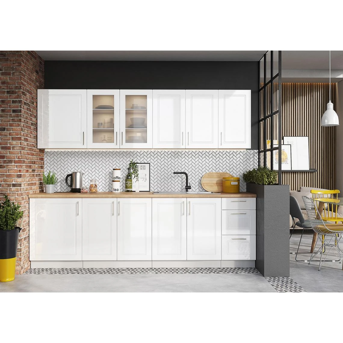 JAZZI est un ensemble de meubles de cuisine avec des façades de type classique en finition laquée. La composition de son caisson et ses façades à base de panneaux de particules de 16 mm et recouverts de mélaminés de grande qualité permettront de nombreuses années d’utilisation. Ses jolies poignées en acier permettant une excellente prise en main, quelle que soit la situation. Cet ensemble s’adresse à toute personne souhaitant faire l’acquisition d’une cuisine ultra complète, tout en restant compacte. Dans ce set vous aurez : meuble bas sous évier 80 cm, meuble bas avec 1 porte 60 cm, meuble bas avec 3 tiroirs 40 cm, meuble bas avec 2 portes 80cm, meuble haut 60 cm, meuble haut avec portes vitrées 80 cm, meuble haut avec égouttoir 80cm (dans ce meuble l’étage du bas est remplacé par un compartiment bas creux qui récupère les gouttes), meuble haut 40cm, CARACTÉRISTIQUES TECHNIQUES: Set de meubles de cuisine classiques et de haute qualité, 8 armoires + 3 tiroirs, Poignées décoratives en acier inoxydable, Tiroirs coulissants metalbox – métalliques, glissières à billes, Façade en blanc brillant + corps en gris + Plinthes de recouvrement assorties, Portes vitrées – verre Satinato, Longueur totale meubles bas: 260 cm, Longueur meubles hauts: 260 cm, Structure en panneaux bois, finition façades laquées, Vendue sans hotte, sans four, sans évier, sans plan de travail Charnières invisibles, Meuble en kit à monter soi-même à l’aide de la notice fournie, Photos des articles le plus fidèle possible, mais restant non contractuelles, les nuances de couleur et le rendu des matières présentés à l’écran pouvant être différents de la réalité