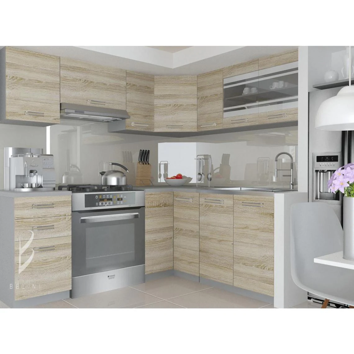 Cet ensemble de meubles de cuisine combine une qualité de fabrication et une esthétique sobre qui s’adaptera à tous les intérieurs.Cuisine livrée sans électroménager, composée de 9 éléments : meuble bas sous évier L 80 cm, meuble bas L 40 cm, meuble bas d’angle L 60 cm, deux meubles hauts L 30 cm, meuble haut d’angle L 42.6 cm, meuble haut L 80 cm, meuble haut L 40 cm, meuble haut sur hotte L 60 cm.Plan de travail inclus, livré en plusieurs morceaux (le morceau pour le meuble sous-évier non fourni), CARACTÉRISTIQUES TECHNIQUES: Set de meubles de cuisine modulaires offrant un bel espace de rangement tout en prenant un minimum de place, Plan de travail inclus – livré en plusieurs morceaux (le morceau pour le meuble sous-évier non fourni), Nombre d’éléments: 9, Façade: aspect bois Sonoma, Corps: gris, Poignées + Plinthes assorties inclus, Largeur de l’ensemble: 360 cm, Profondeur meubles hauts 30 cm; Profondeur meubles bas: 60/45 cm, Profondeur plan de travail : 60 cm, Profondeur meubles bas: 45 cm + 15 cm de vide sanitaire, Meuble en kit à monter soi-même à l’aide de la notice fournie, Vendu sans hotte, sans four, sans évier, sans frigo, sans petit électroménager, Mode de livraison pour ce produit: Livraison palette au pied de l’immeuble, Photos des articles le plus fidèle possible, mais restant non contractuelles, les nuances de couleur et le rendu des matières présentés à l’écran pouvant être différents de la réalité