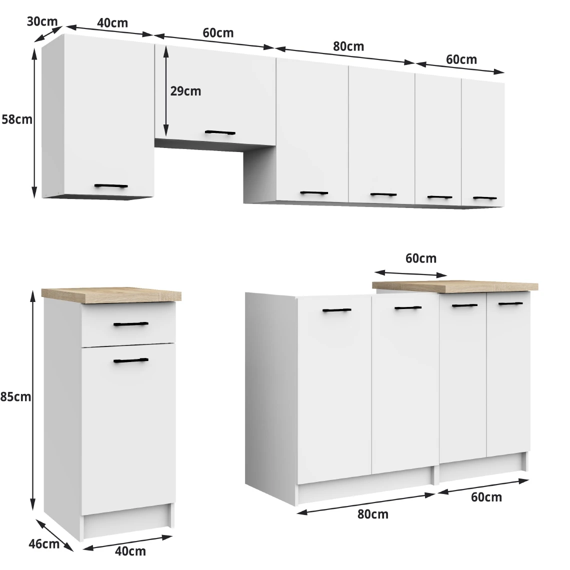 NOLA 240 est un ensemble de meubles de cuisine adapté parfaitement aux studios et appartements avec la cuisine ouverte. Son style moderne et structure de haute qualité vous permettront de trouver un équilibre entre rôle utile et cuisine design. Le lot est composé de: Plan de travail (livré en plusieurs morceaux, le morceau pour le meuble sous évier non inclus), meuble haut de 40 cm, meuble hotte de 60 cm, meuble haut de 80 cm, meuble haut de 60 cm, meuble bas avec un tiroir de 40 cm, meuble sous évier de 80 cm, meuble bas de 60 cm , POINT FORTS: Set de meubles de cuisine compactes et de haute qualité, Plan de travail inclus, Plinthes de recouvrement assorties, Cuisine linéaire, Profondeur meubles bas: 44,5CM ; Profondeur meubles hauts: 29CM ; Façade: imitation bois Sonoma + Corps: Blanc ; CARACTÉRISTIQUES TECHNIQUES: Longueur meubles bas: 180 cm, Longueur meubles hauts: 240 cm, Profondeur du plan de travail: 60 cm, Vendu sans hotte, sans four, sans évier , Livré avec pièces de montage, Meuble en kit à monter soi-même à l’aide de la notice fournie