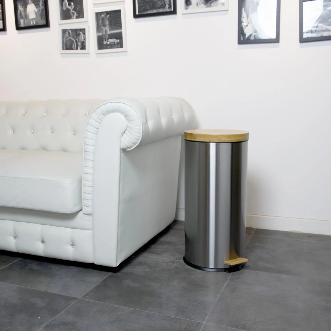 - Corps en acier INOX (0.4mm) et couvercle en bois naturel Bambou. Nouveau modèle. Inclus: Un seau amovible avec anse pour maintenir votre sac poubelle, et un anneau au sol pour la protection des sols fragiles