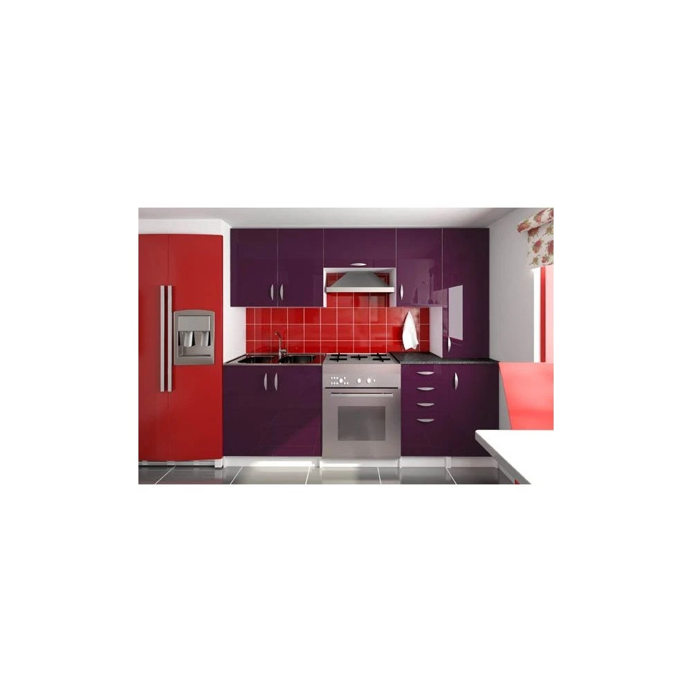 Une cuisine de 2m20 avec façade laquée.Éléments hauts:- 1 élément 2 portes de 80cm (31 cm de profondeur, 71,7 cm de hauteur, 1 étagère)- 1 élément hotte de 60cm (31 cm de profondeur, 40 cm de hauteur)- 1 élément 1 porte de 40cm (31 cm de profondeur, 71,7 cm de hauteur, 1 étagère)- 1 élément colonne de 40cm (31 cm de profondeur, 120 cm de hauteur, 2 étagères)Éléments bas: – 1 sous-évier de 80cm (51 cm de profondeur, 82 cm de hauteur)- 1 élément 4 tiroirs de 40cm (51 cm de profondeur, 82 cm de hauteur)- 1 élément 1 porte de 40cm (51 cm de profondeur, 82 cm de hauteur, 1 étagère)Plans de travail: 2 de 40cm. (profondeur 60cm, hauteur 3cm). Couleur gris moucheté. Composition : panneau de particules agglomérées.Caractéristiques techniques:Coloris disponibles : blanc, rouge, noir, gris, noir et blanc, crème, chocolat, cappuccino, bordeaux et aubergine.Matière façades: laqué.Panneaux de fibre haute densité (+/- 880kg/m3).Composition: fibre de bois ou végétale liée par pression thermique.Épaisseur du panneau: de 16 à 18mm.Épaisseur du vernis: 4 couches.Matière caissons: Panneaux de particules agglomérées.Densité du panneau: de 480 à 730kg/m3.Épaisseur du caisson / panneau: 16mm.Poignées: en plastique, chrome.Caractéristiques particulières:Meuble hotte équipé de verins.Éléments équipés d’accroches murales (pour chaque accroche, un élément de fixation murale sans visserie est offert).Meuble en kit à monter soi même. Une notice détaillée est fournis dans chaque carton. Vous pouvez également la télécharger sur le site. Tous les modules sont indépendants, vous pouvez disposer les élements comme vous le souhaitez.