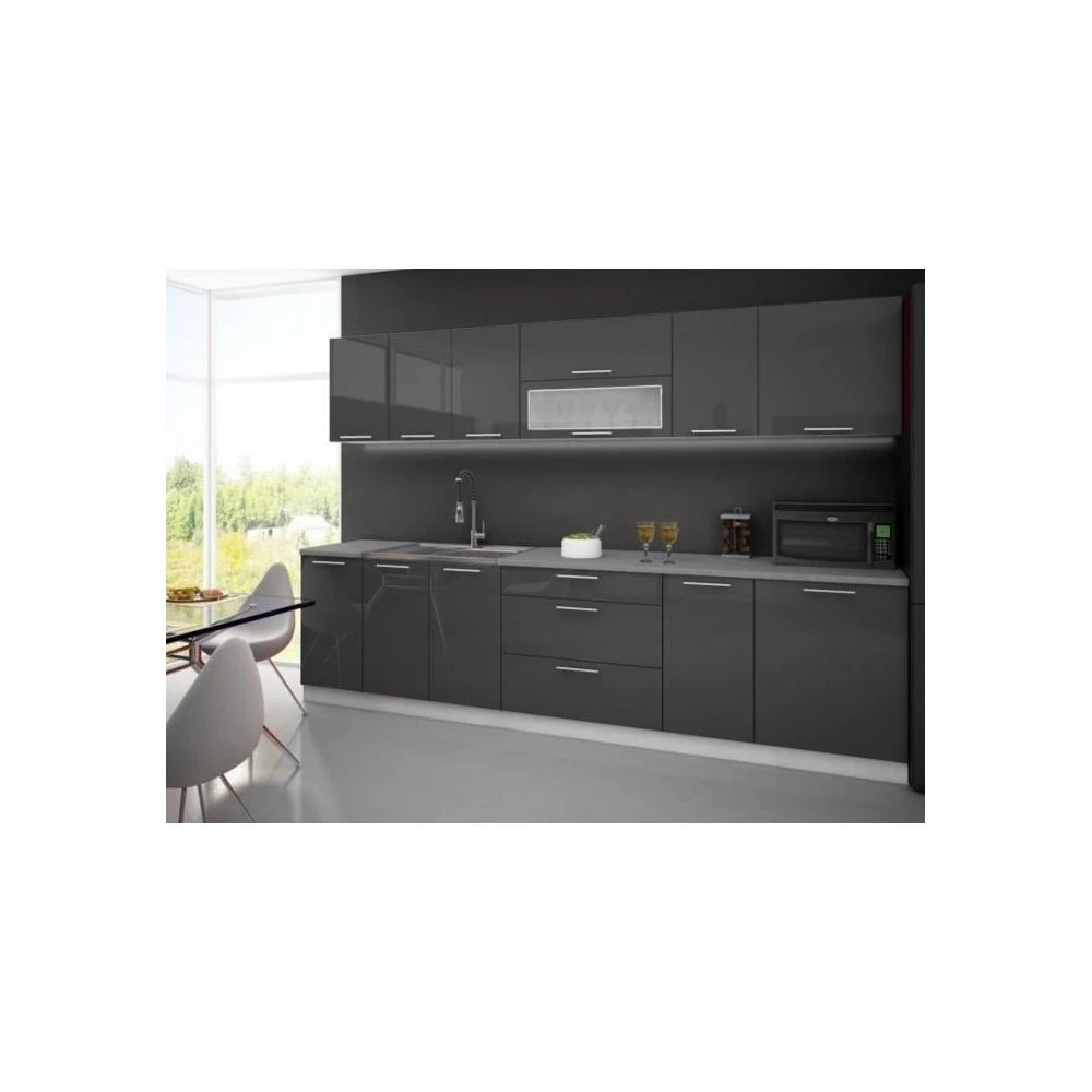 Une cuisine de 3m avec façade laquée.Éléments hauts :- 2 éléments 40 cm 1 porte (31 cm de profondeur, 71,7 cm de hauteur, 1 étagère)- 1 élément 80 cm 2 portes (31 cm de profondeur, 71,7 cm de hauteur, 1 étagère)- 1 élément 80 cm avec une porte capot et une porte vitrine (31 cm de profondeur, 71,7 cm de hauteur, 1 étagère)- 1 élément 60 cm 1 porte (31 cm de profondeur, 71,7 cm de hauteur, 1 étagère)Éléments bas : – 2 éléments 40 cm 1 porte (51 cm de profondeur, 82 cm de hauteur, 1 étagère)- 1 meuble sous-évier de 80 cm (51 cm de profondeur, 82 cm de hauteur)- 1 élément 80 cm avec 3 tiroirs (51 cm de profondeur, 82 cm de hauteur, 1 étagère)- 1 élément 60 cm 1 porte (51 cm de profondeur, 82 cm de hauteur, 1 étagère)Vendu sans plan de travail. Vous pouvez en acheter sur le site dans la catégorie plan de travail.Caractéristiques techniques :Coloris disponibles : blanc, rouge, noir, gris, noir et blanc, crème, chocolat, cappuccino, bordeaux et aubergine.Matière façades : laqué.Panneaux de fibre haute densité (+/- 880kg/m3).Composition : fibre de bois ou végétale liée par pression thermique.Épaisseur du panneau : de 16 à 18mm.Épaisseur du vernis : 4 couches.Matière caissons : Panneaux de particules agglomérées.Densité du panneau : de 480 à 730kg/m3.Épaisseur du caisson / panneau: 16mm.Poignées: en plastique, chrome.Caractéristiques particulières :Meuble hotte équipé de verins.Éléments équipés d’accroches murales.Meuble en kit à monter soi même. Une notice détaillée est fournis dans chaque carton