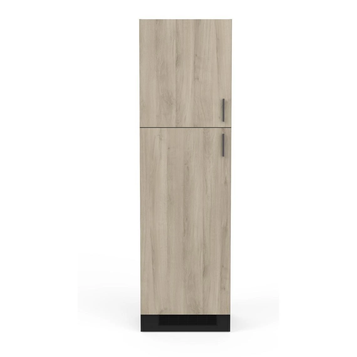 Colonne de cuisine équipée de 2 portes et 5 rayons intérieurs réglables sur 3 niveaux en panneaux de particules épaisseur 16mm mélamine chêne kronberg et noir mat. Résistant à l’eau revêtement 100% mélamine. Poignée barrette en plastique noir. Double fonctionnalité soit colonne de rangement ou possibilité d’intégrer un frigo; Fabriqué en France.