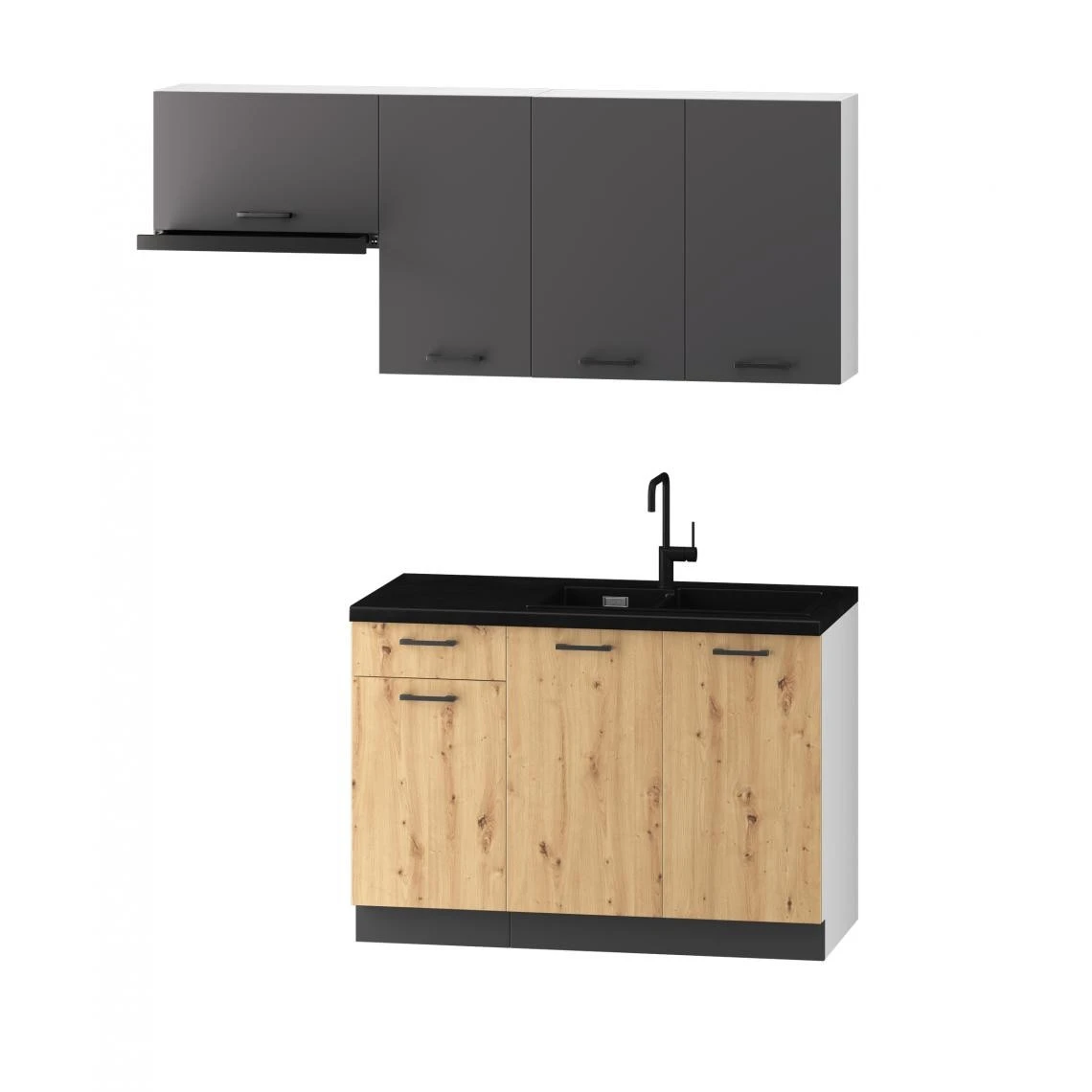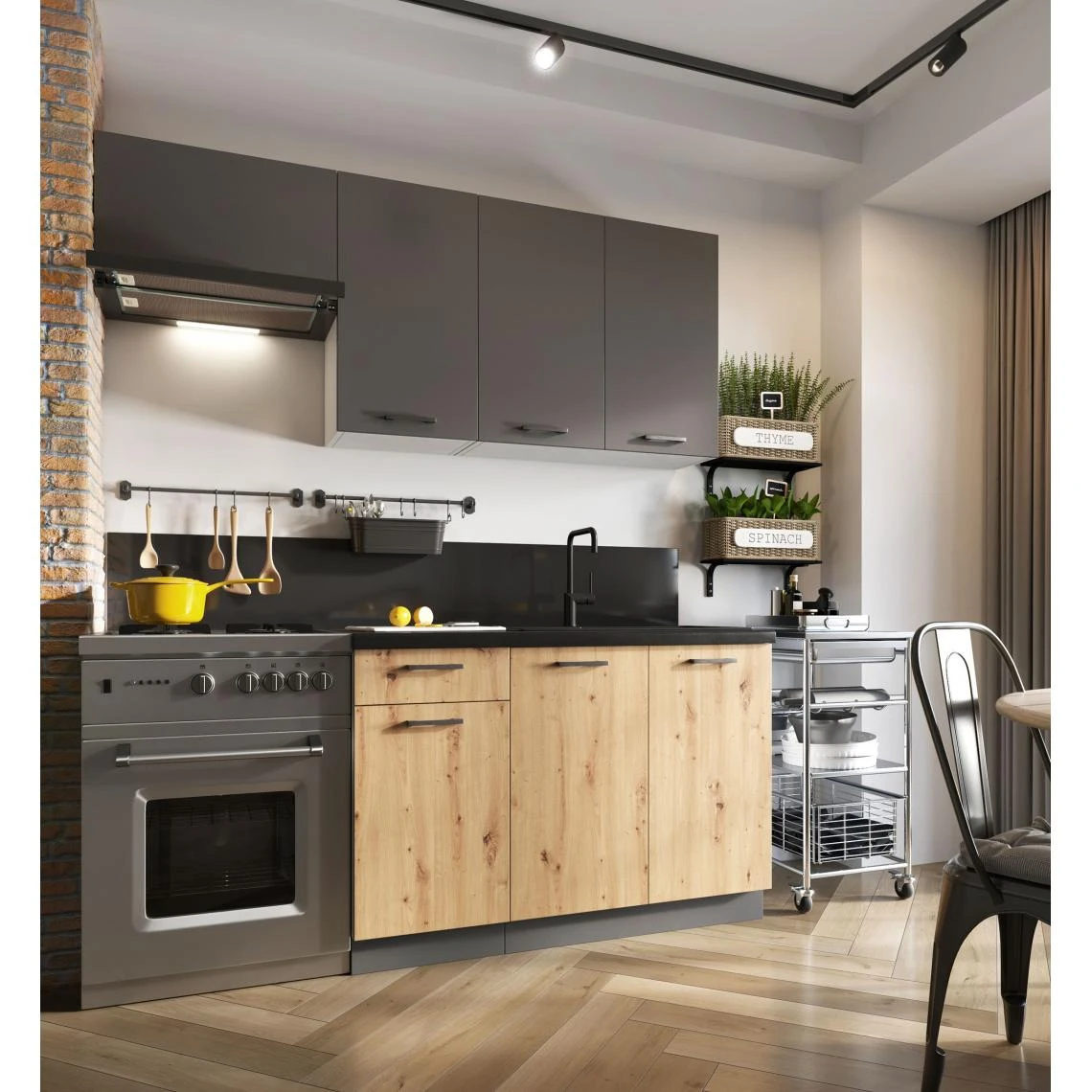 Cuisine complète composée de 5 meubles avec façades supérieures gris mat, façades inférieures couleur chêne artisan, structures couleur gris clair et plinthes couleur gris mat. Plan de travail non inclus.