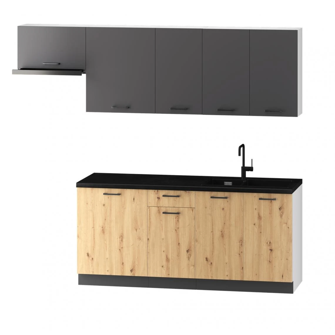 Cuisine complète composée de 7 meubles avec façades supérieures gris mat, façades inférieures couleur chêne artisan, structures couleur gris clair et plinthes couleur gris mat.