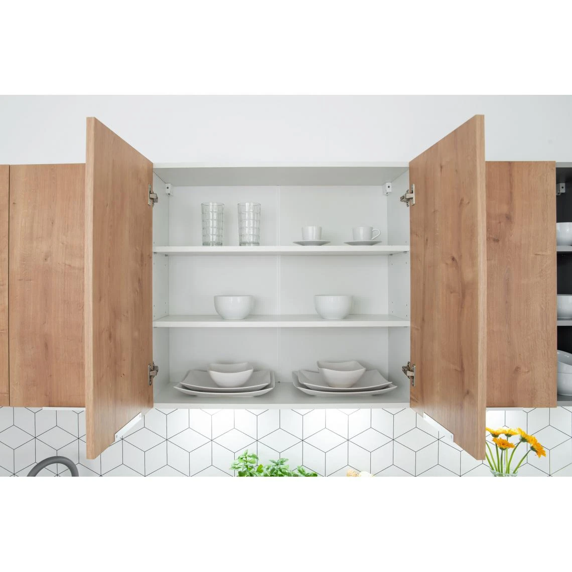 Cuisine complète composée de 8 meubles avec façades supérieures couleur chêne, façades inférieures couleur gris clair, structures couleur blanc et plinthes couleur gris clair. Plan de travail non inclus.