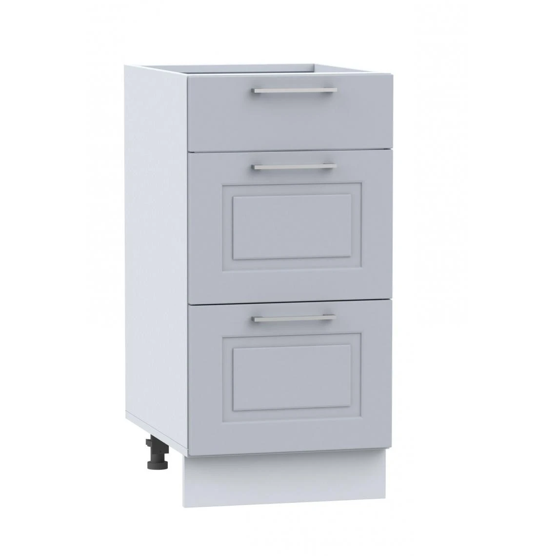 Cuisine complète composée de 7 meubles avec façades couleur gris mat, structures et plinthes couleur gris clair mat. Plan de travail non inclus.