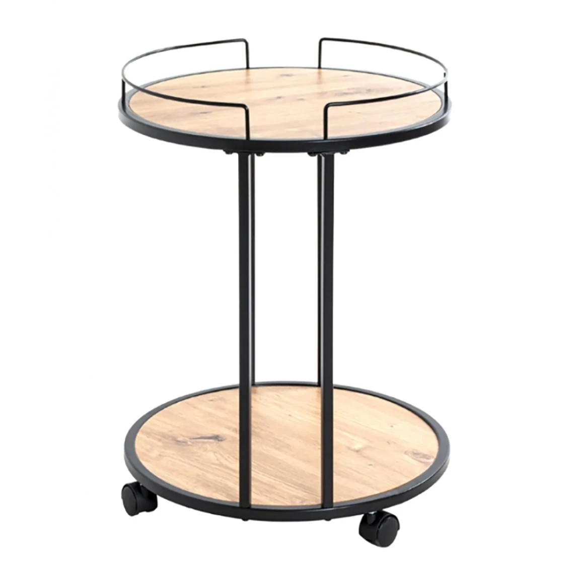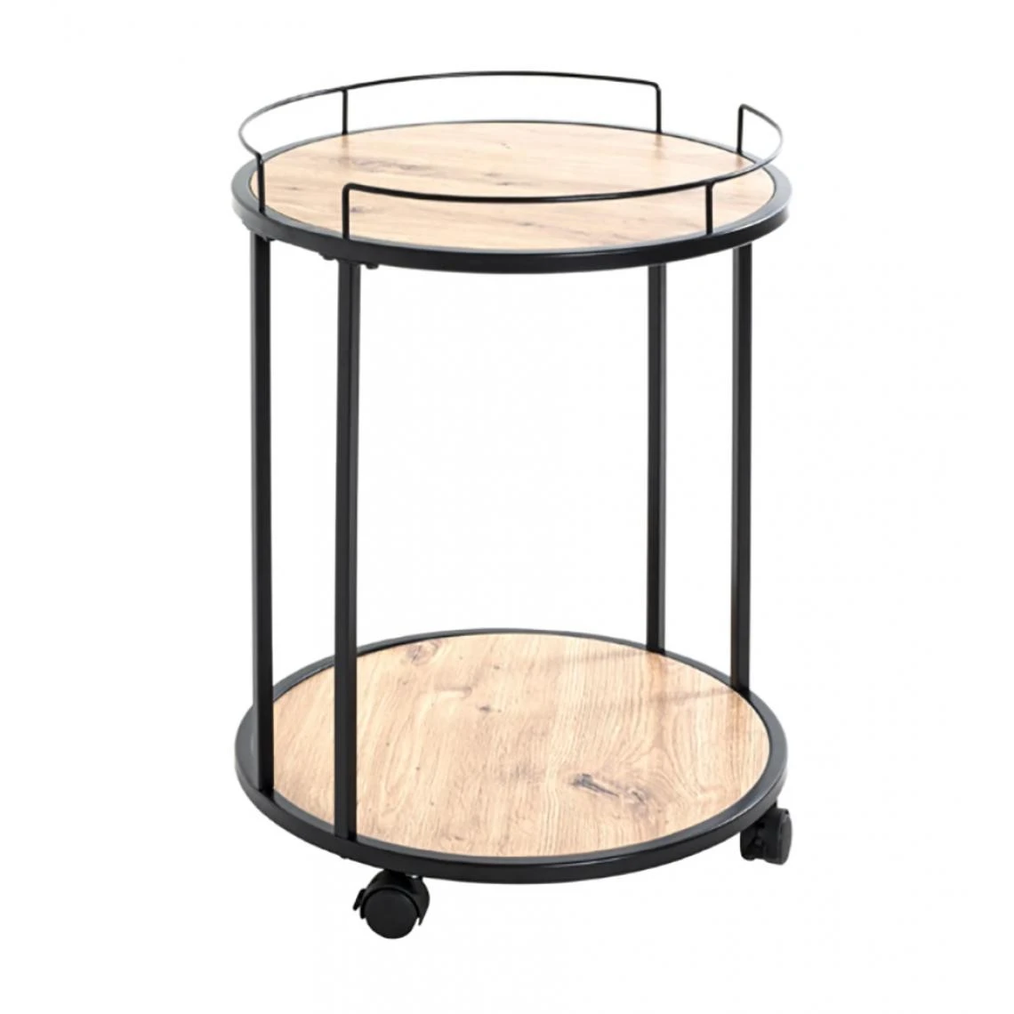 Desserte ronde en tube d’acier laqué noir, plateaux en MDF décor chêne (mélamine). Sur roulettes