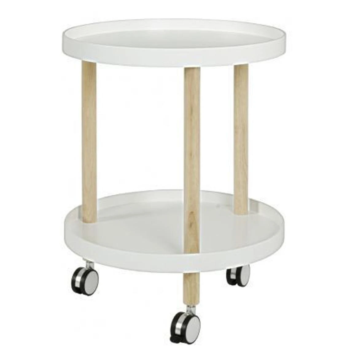 Desserte en bois massif nature, plateaux en MDF laqué blanc, sur roulettes. cette table roulante vous permettra aisément de passer de la cuisine à la salle à manger. Dimensions : Diam 50 x H60 cm. Matière : bois massif. Couleur : nature-blanc. Poids : 6.3 kg