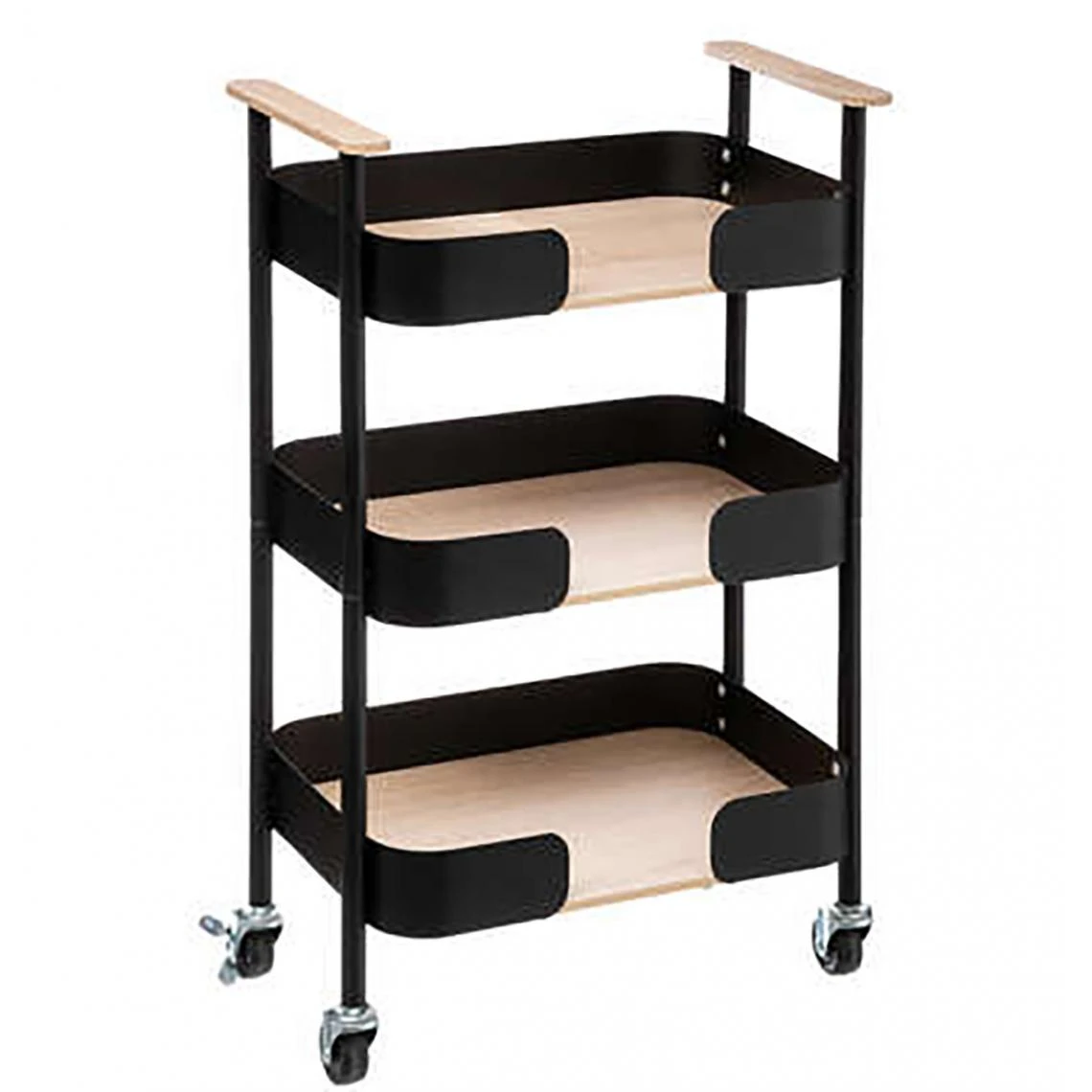 Cette jolie desserte en fer apportera une touche de décoration en plus de vous apporter un espace de rangement supplémentaire grâce à ses 3 niveaux. Le mélange de bois et de fer noir lui donne une certaine modernité. Les 4 roulettes vous permettront de la déplacer facilement. Livré en kit.
