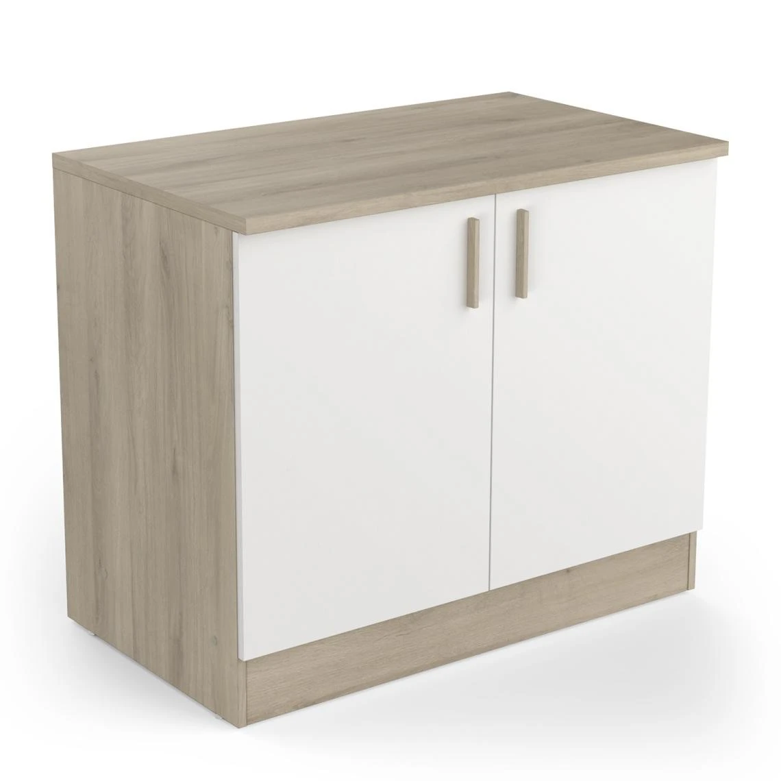 Meuble bas de cuisine en panneaux de particules épaisseur 16mm mélamine chêne kronberg et blanc, avec poignée barrette en plastique kronberg. Plan de travail conçu en panneau de particules épaisseur 25mm, mélamine chêne kronberg avec une belle largeur pour accueillir tous types d’évier. Façades en panneaux de particules épaisseur 16mm, coloris blanc. Revêtement 100% mélamine, résistant à l’eau. Fabriqué en France.