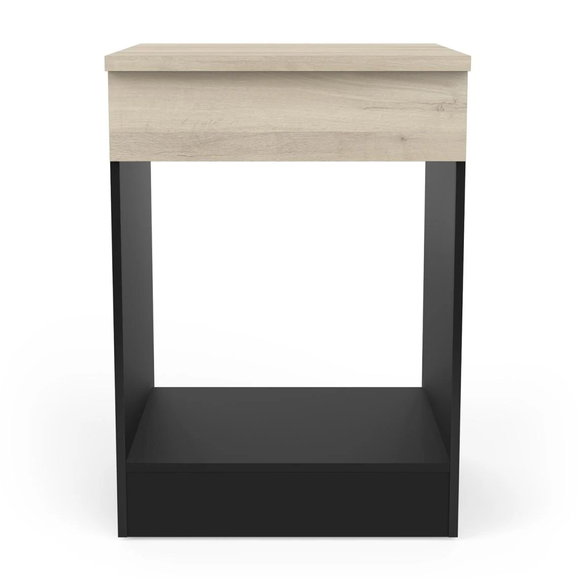 Meuble bas de cuisine en panneaux de particules épaisseur 16mm, mélamine décor chêne kronberg, noir mat. Résistant à l’eau revêtement 100% mélamine. Style industriel associant du bois chaleureux et des touches de noir mat. Plan de travail intégré, bandeau coupable en