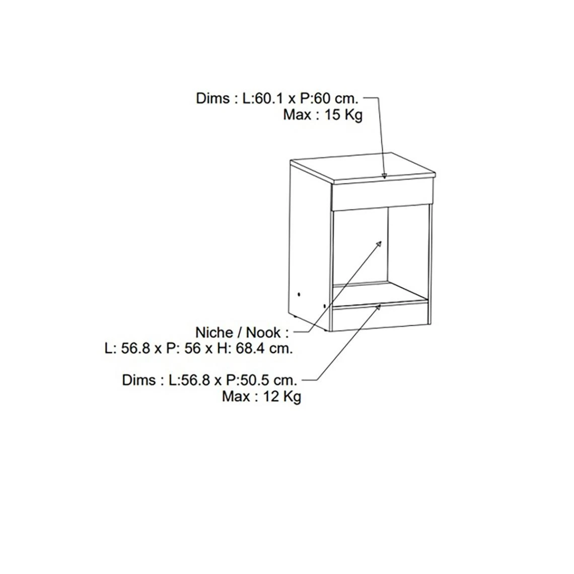 Dimensions de niche : Longueur 56,8 x profondeur 56 x hauteur 68,40 cm / charge max : 12kg