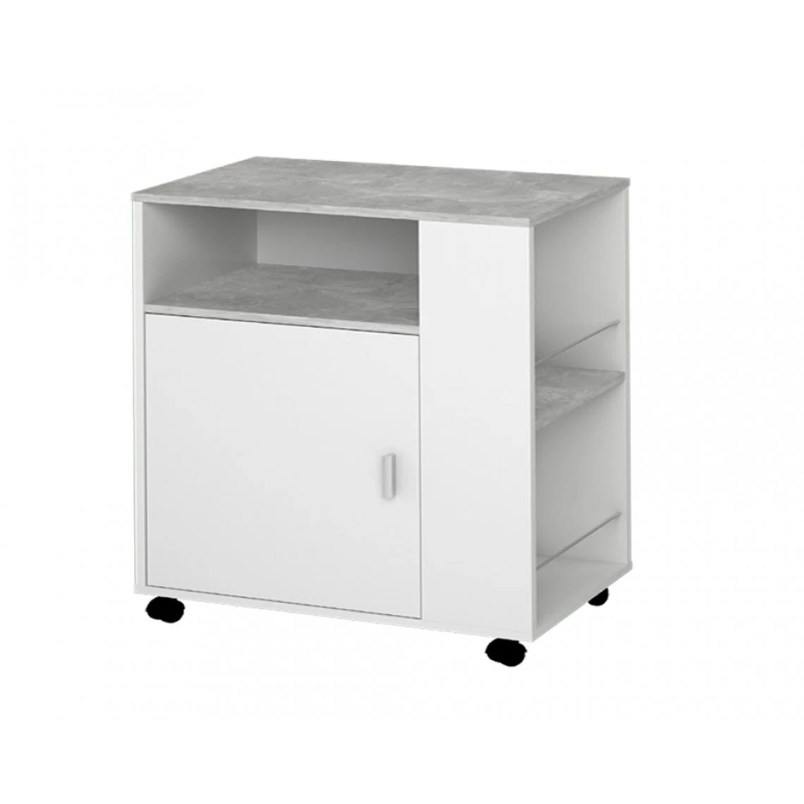 Meuble de cuisine d’une portes et 3 compartiments (charnières métalliques). Fabriqué en panneaux de particules haute densité 16mm d’épaisseur avec décor et finition mélamine de qualité coloris blanc/gris béton. Produit de fabrication Espagnol certifié PEFC. Livré en kit.