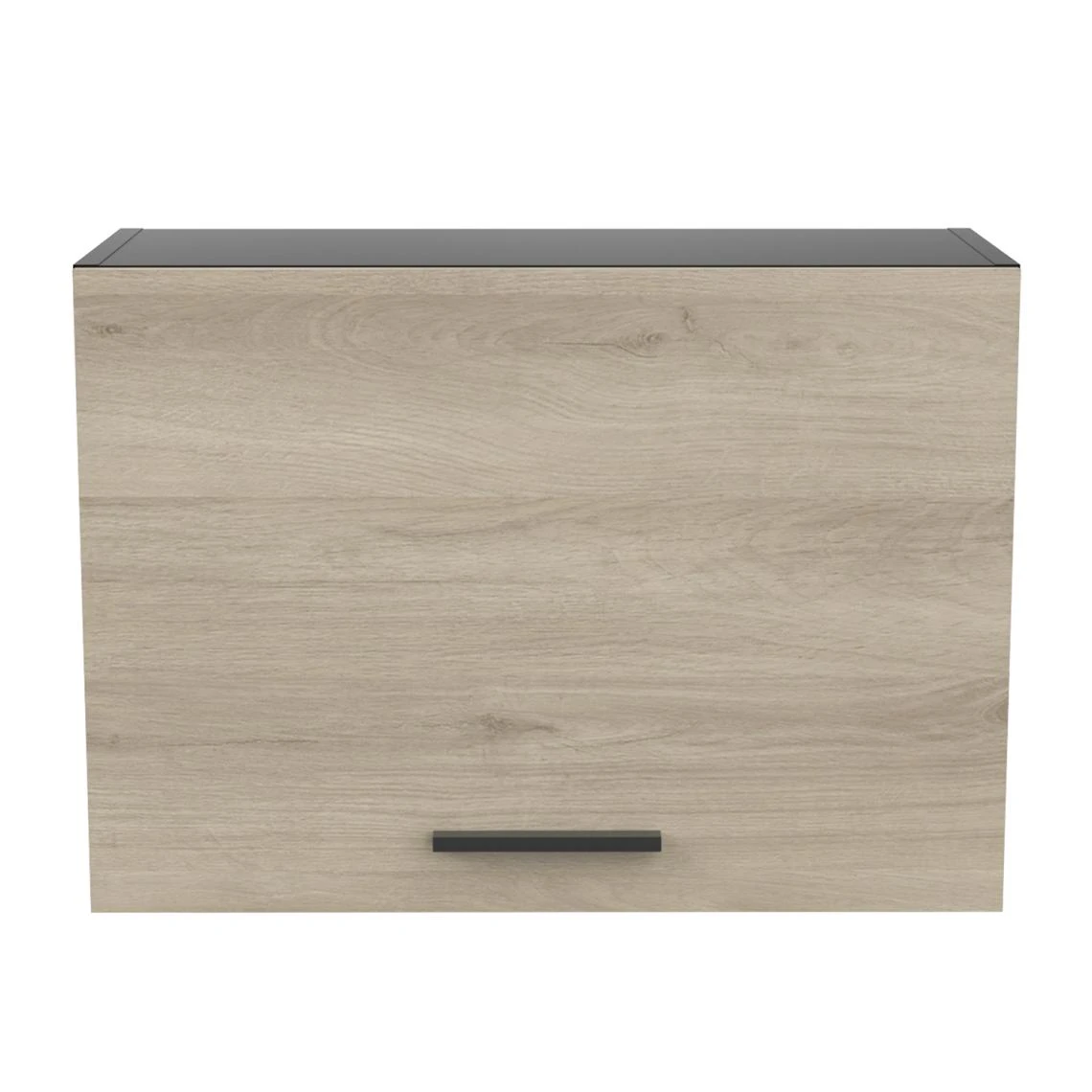 Meuble pour hotte en en panneaux de particules épaisseur 16mm mélamine coloris chêne kronberg et noir mat. Poignée barrette en plastique noir. Equipé d’une porte abattante avec 1 rayon inférieur. Résistant à l’eau revêtement 100% mélamine. Revêtement des façades effet bois. Ouverture facile par abattant. Fabriqué en France.