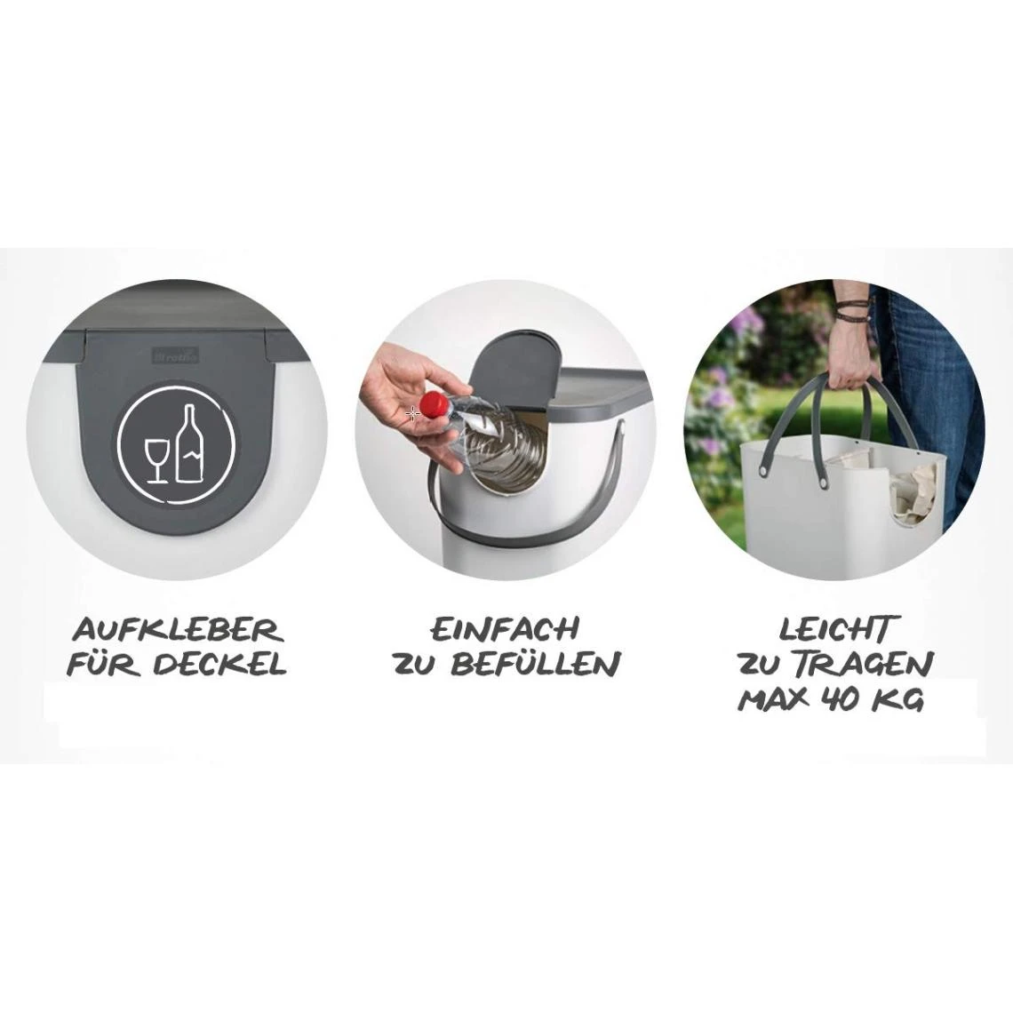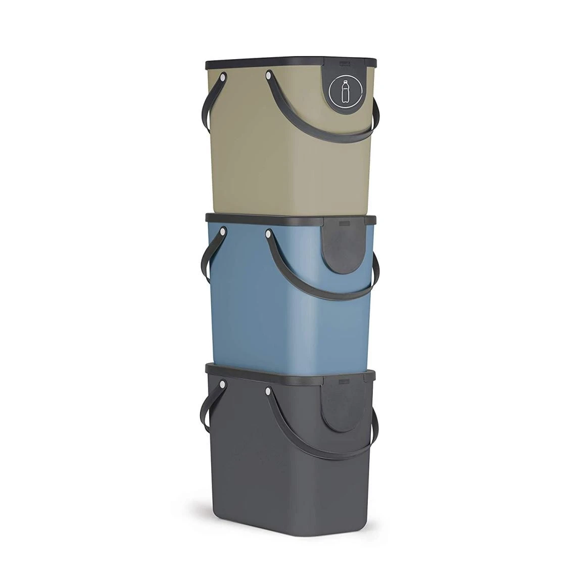 Contenu de la livraison : 3 systèmes de tri des déchets recyclés, conteneurs en plastique avec deux poignées ? 6 autocollants avec motifs (carton, PET, verre, papier, déchets) ? Conteneur bleu, cappuccino et anthracite, couvercle et anse anthracite ? Fabriqué par Rotho.