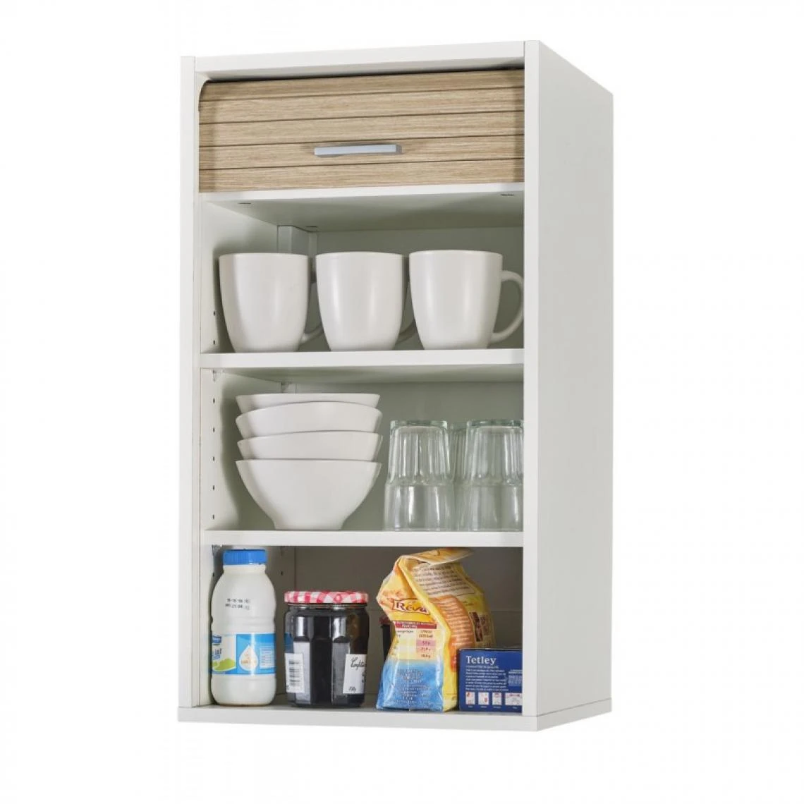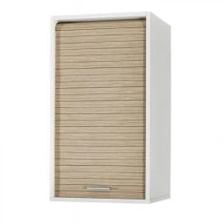 Meuble Elément haut de Cuisine coloris Blanc + Rideau Alu, Chêne ou Noir. A poser sur le plan de travail ou à suspendre à mur Largeur 40 cm x Hauteur 72 cm x Profondeur 35 cm Il fait les mêmes dimensions que les éléments hauts de la plupart des cuisines équipées. Descriptif : – Equipé d’un rideau coulissant de haut en bas – 2 tablettes réglables en hauteur. – Le meuble peut être suspendu au mur (fixations fournies) ou posé sur le plan de travail. – Le caisson (bas du meuble) est livré avec le meuble mais peut ne pas être installé. Hauteur Totale du meuble : 70.4 cm, sans la partie basse Vous pouvez ainsi glisser directement des objets du plan de travail à l’intérieur du meuble sans les lever. (cafetière, grille-pain,….). La hauteur en gardant le caisson est de 72 cm Caractéristiques techniques : – Panneaux de particules de bois mélaminés (2 faces) qualité E1 épaisseur 16 mm – Arrière : panneaux de fibres de bois (MDF), épaisseur 5 mm revêtu d’un décor – Rideau : Baguettes de 4 cm épaisseur 4 mm, en Panneaux de fibres de bois (MDF), revêtues d’un décor et collées sur une toile en coton. – Garantie : 2 ans – Meuble Eco-conçu – Fabriqué en France Montage : – Meuble Livré démonté – Difficulté de montage : facile – En bas de la page, vous pouvez télécharger la notice de montage. – Une notice de montage papier sera jointe au meuble. Dimensions utiles : – Tablettes : Largeur 36.8 cm Profondeur 30 cm – Intérieur : Largeur 36.8 cm Hauteur 55.1 cm Profondeur 30 cm Livraison : – Livré en 2 colis : 15 kg pour la structure du meuble et 1.5 kg pour le rideau. – Livraison gratuite, sous 7 – 10 jours du lundi au vendredi, au rez-de-chaussée.