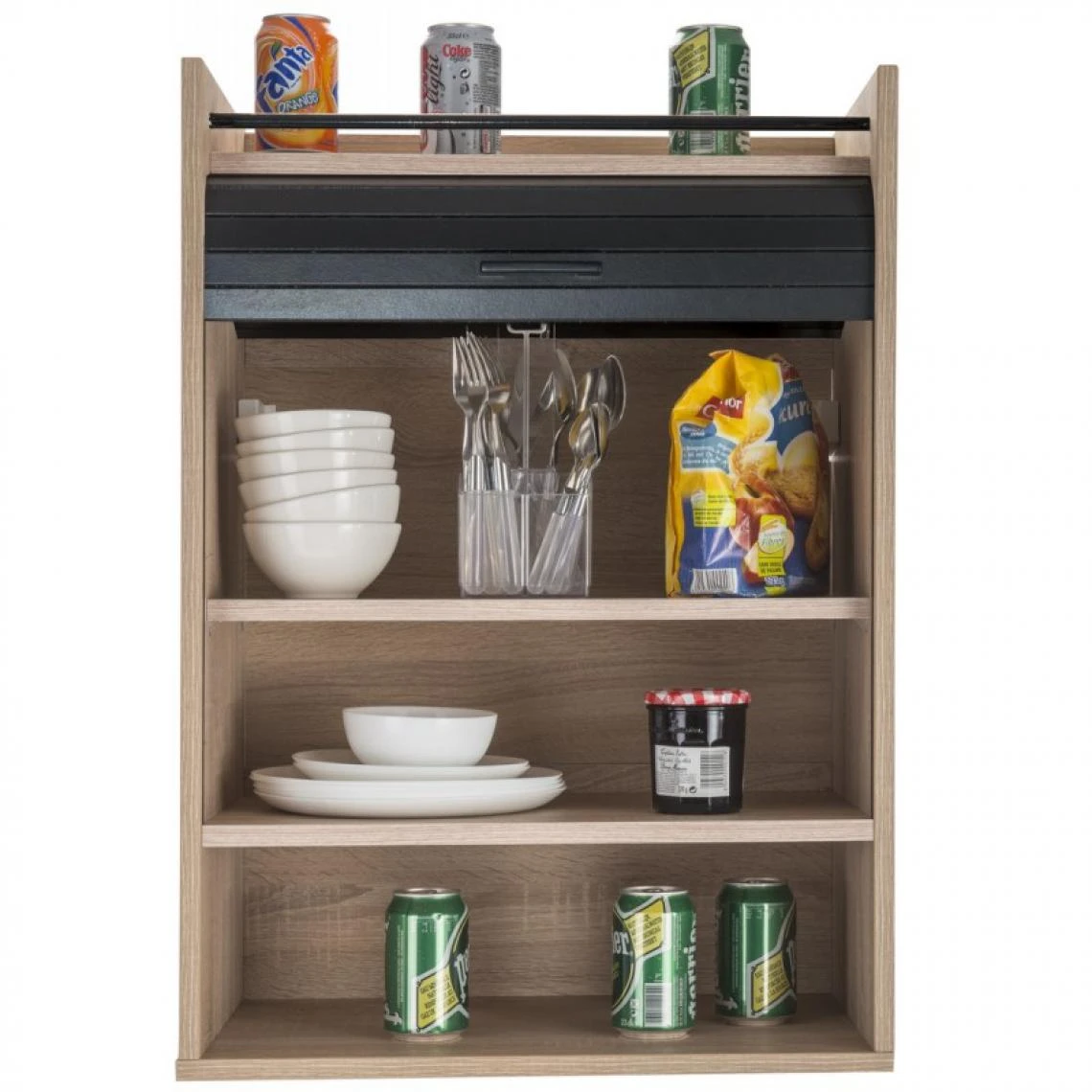 Meuble de Cuisine Chêne 1 Rideau 3 Niches + Rideau Blanc ou Noir Largeur 54 cm x Hauteur 75 ou 76.6 cm x Profondeur 35.4 cm Le meuble peut-être fixé au mur (système d’accroche fourni) Hauteur 76.6 cm ou Poser sur un plan de travail. Dans ce cas, on peut retirer la tablette du bas donnant ainsi une hauteur totale de 75 cm Descriptif : – 3 Niches => Niche haute ouverte avec 1 tige métallique pour retenir les objets => Niche centrale fermée par un rideau coulissant de haut en bas. Avec 1 étagère réglable en hauteur => Niche basse ouverte. – Le meuble peut être suspendu au mur (fixations fournies) ou posé sur le plan de travail. – Le caisson (bas du meuble) est livré avec le meuble mais peut ne pas être installé. Vous pouvez ainsi glisser directement des objets du plan de travail à l’intérieur du meuble sans les lever. (cafetière, grille-pain,….). Caractéristiques techniques : – Panneaux de particules de bois mélaminés (2 faces) qualité E1 épaisseur 16 mm – Rideau : Panneaux de fibres de bois revêtus d’un décor coloris blanc. – Livré démonté (montage facile). – Garantie : 2 ans – Meuble éco-conçu – Fabriqué en France – Livré en 2 colis. – Poids total des colis : 22 kg Dimensions utiles : – Niche haute : Largeur 50.8 cm Hauteur 6.2 cm Profondeur 28 cm – Niche centrale : Largeur 50.8 cm Hauteur 42.9 cm Profondeur 31 cm – Niche basse : Largeur 50.8 cm Hauteur 16 cm Profondeur 33.1 cm Livraison gratuite, sous 7 – 10 jours du lundi au vendredi, au rez-de-chaussée.