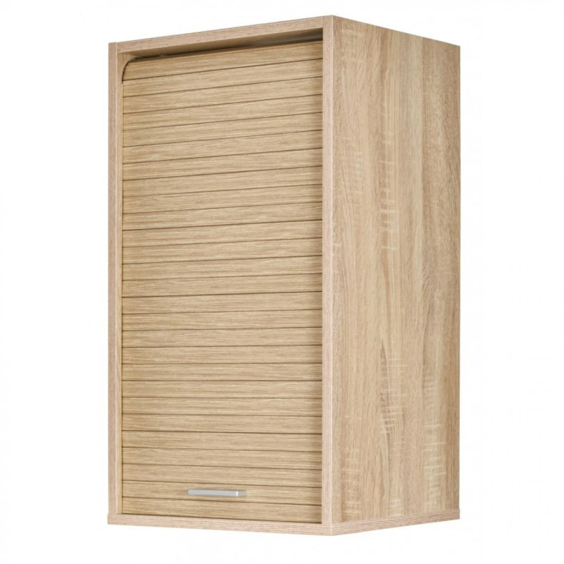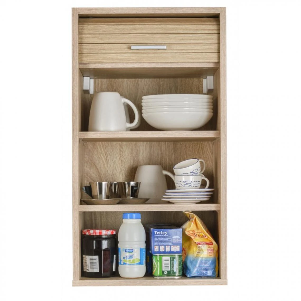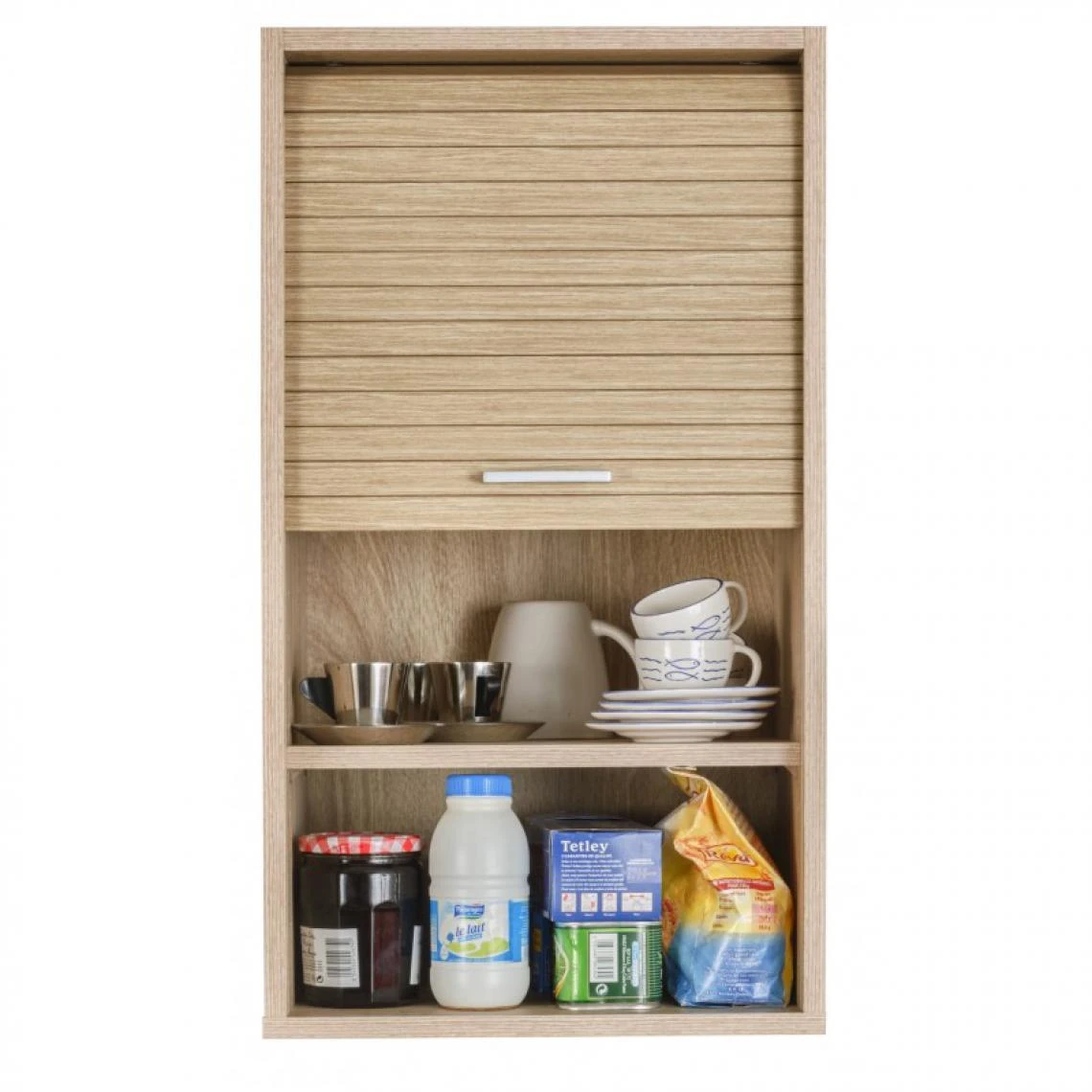 Meuble Elément haut de Cuisine coloris Alu à poser sur le plan de travail ou à suspendre à mur Largeur 40 cm x Hauteur 72 cm x Profondeur 35 cm Il fait les mêmes dimensions que les éléments hauts de la plupart des cuisines équipées. Descriptif : – Equipé d’un rideau coulissant de haut en bas – 2 tablettes réglables en hauteur. – Le meuble peut être suspendu au mur (fixations fournies) ou posé sur le plan de travail. – Le caisson (bas du meuble) est livré avec le meuble mais peut ne pas être installé. Hauteur Totale du meuble : 70.4 cm, sans la partie basse Vous pouvez ainsi glisser directement des objets du plan de travail à l’intérieur du meuble sans les lever. (cafetière, grille-pain,….). La hauteur en gardant le caisson est de 72 cm Caractéristiques techniques : – Panneaux de particules de bois mélaminés (2 faces) qualité E1 épaisseur 16 mm – Arrière : panneaux de fibres de bois (MDF), épaisseur 5 mm revêtu d’un décor – Rideau : Baguettes de 4 cm épaisseur 4 mm, en Panneaux de fibres de bois (MDF), revêtues d’un décor coloris chêne et collées sur une toile en coton. – Garantie : 2 ans – Meuble Eco-conçu – Fabriqué en France Montage : – Meuble Livré démonté – Difficulté de montage : facile – En bas de la page, vous pouvez télécharger la notice de montage. – Une notice de montage papier sera jointe au meuble. Dimensions utiles : – Tablettes : Largeur 36.8 cm Profondeur 30 cm – Intérieur : Largeur 36.8 cm Hauteur 55.1 cm Profondeur 30 cm Livraison : – Livré en 2 colis : 15 kg pour la structure du meuble et 1.5 kg pour le rideau. – Livraison gratuite, sous 7 – 10 jours du lundi au vendredi, au rez-de-chaussée.