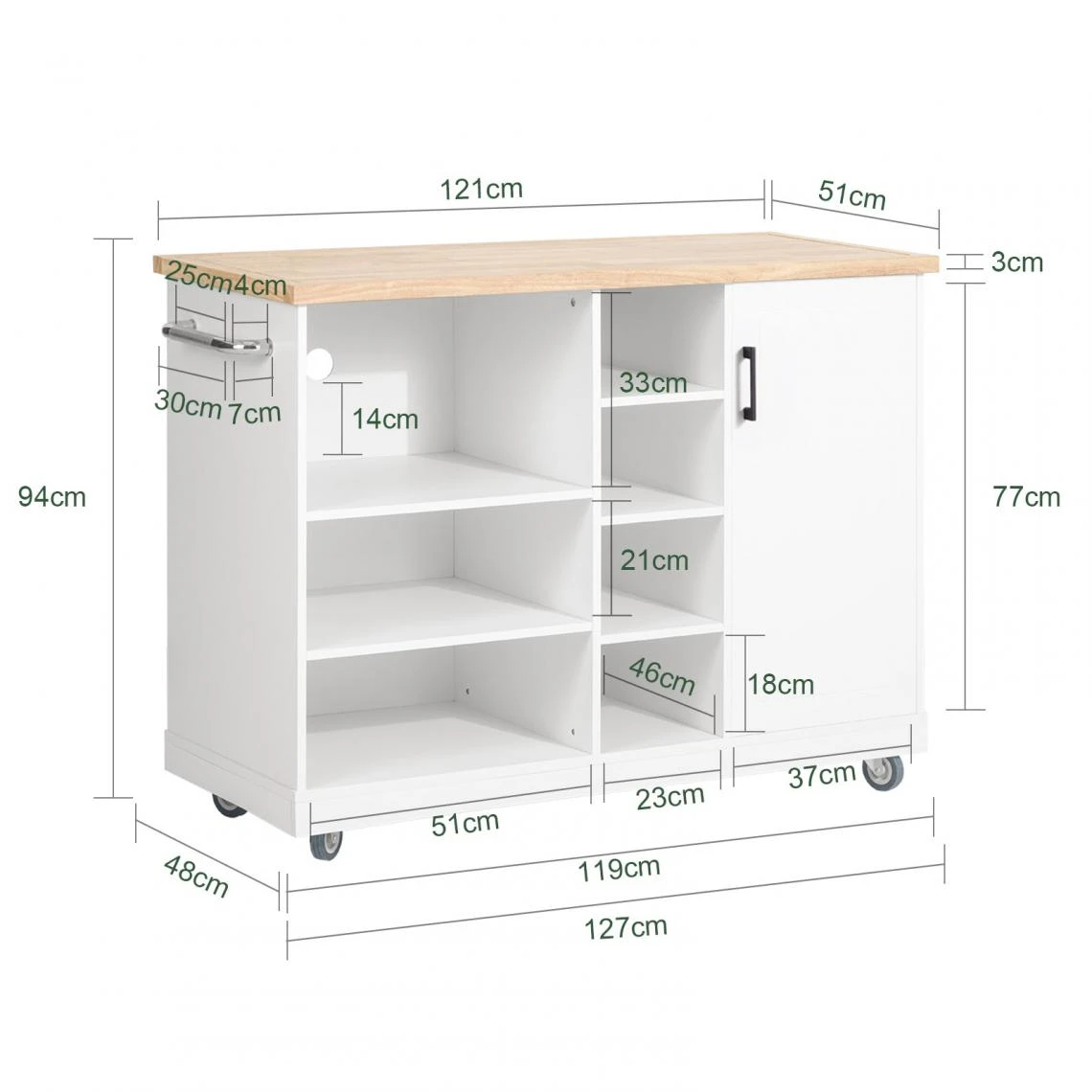- Matériaux : MDF classe E1. Dimension(LxPxH): 127 x 48 x 94 cm. Plan de travail : 121 x 51 cm. Capacité de charge jusqu’à 75 kg. Grâce au plan de travail spacieux en bois d’hévéa, il vous offre beaucoup d’espace supplémentaire pour la préparation des aliments.