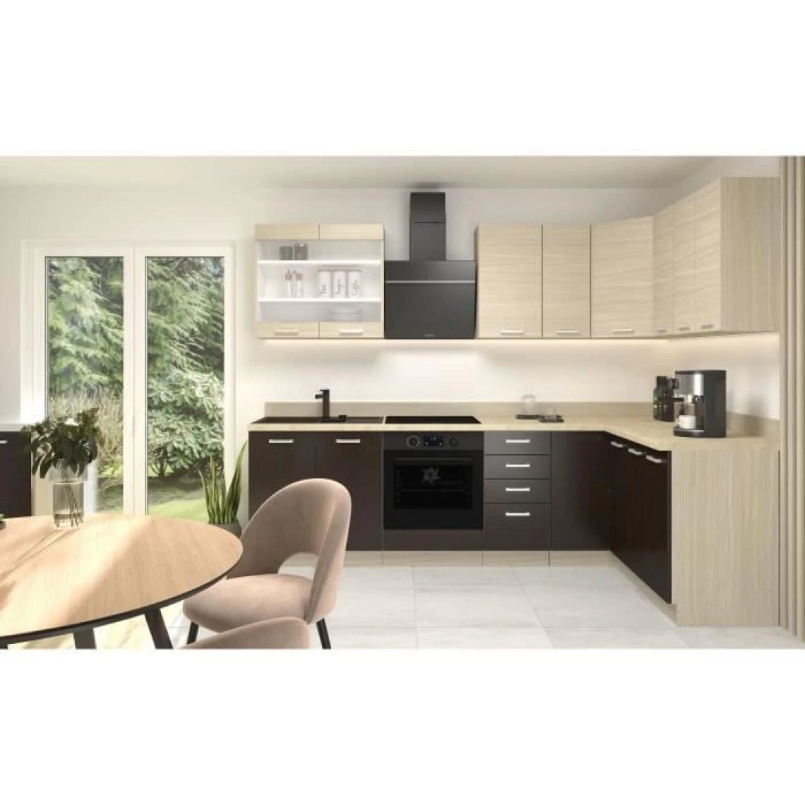 Points forts Tbs CHAMONIX Cuisine complete d’angle Réversible – Mélamine décor chene – 270 x 150 cm – Plan de travail non inclus
