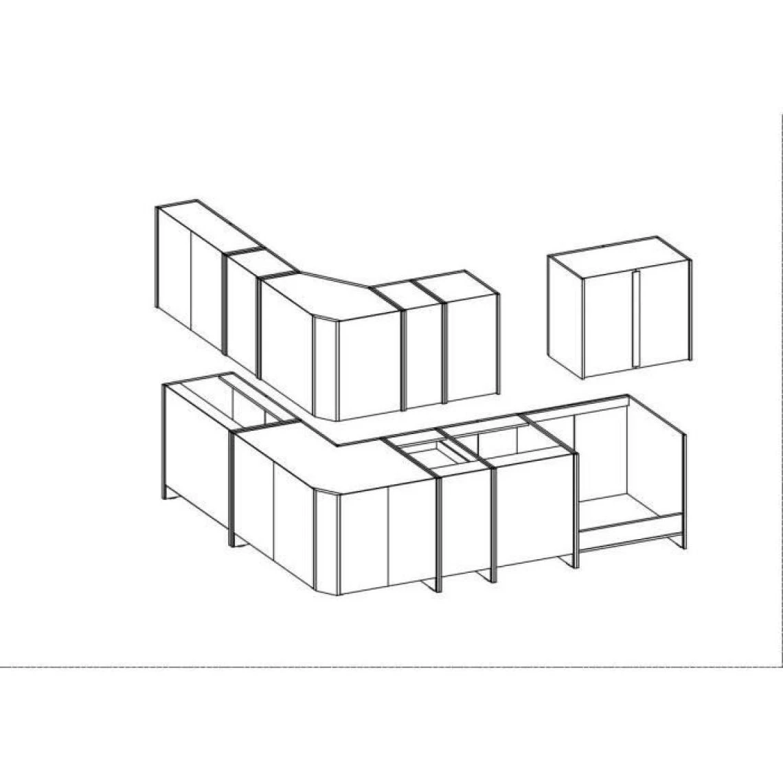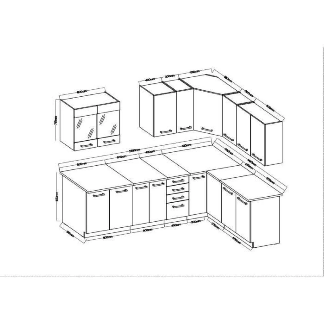 cuisine complete d’angle CHAMONIX 270x150cm composée de 1 meubles sous évier 80cm, 1 meuble four 60cm, 1 meuble bas 4 tiroirs 40cm, 1 meuble bas d’angle 89x89cm, 1 meuble bas 60cm, 1 meuble vitre haut 80cm, 1 meuble haut 40cm, 2 meubles hauts 30cm, 1 meuble haut d’angle 58c58cm, 1 meuble haut 60cm – Plan de travail non inclus – Angle Réversible