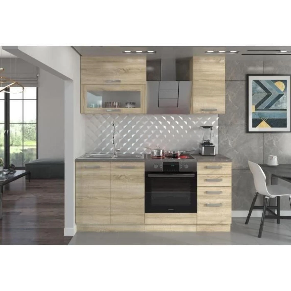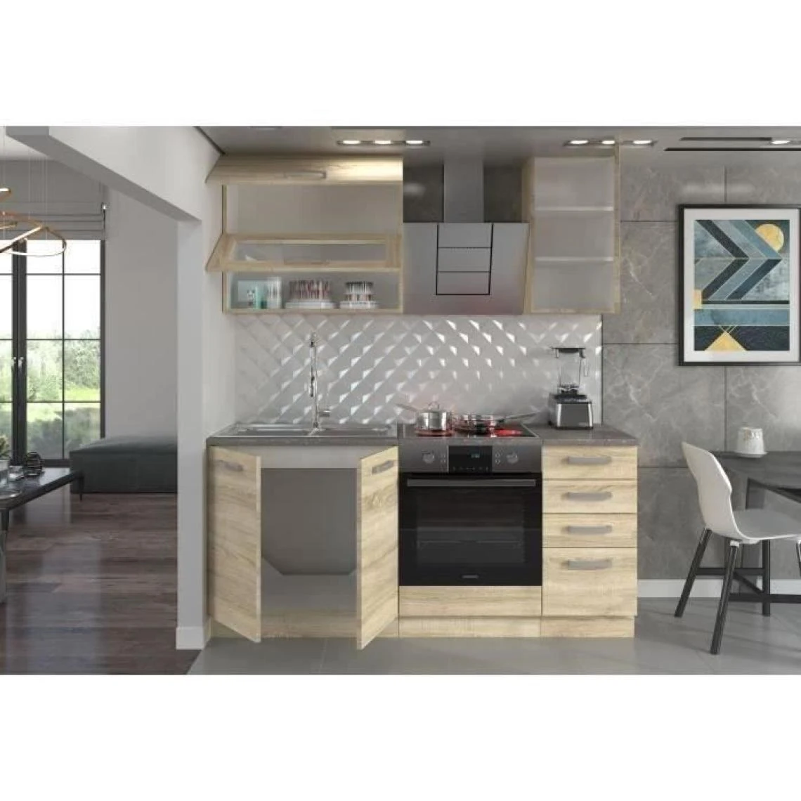 La cuisine LASSEN de 180cm de largeur en coloris bois sonoma avec meuble four est fabriquée a partir de matériaux résistants et d’excellente qualité. Les caissons et les facades sont réalisés en panneaux de particules (16mm) et recouverts de mélaminé. Les chants sont en pvc 2 mm. Le plan de travail inclus de profondeur 60 cm est réalisé en panneaux de particules (épaisseur 28mm), stratifié i, chants mélaminés .